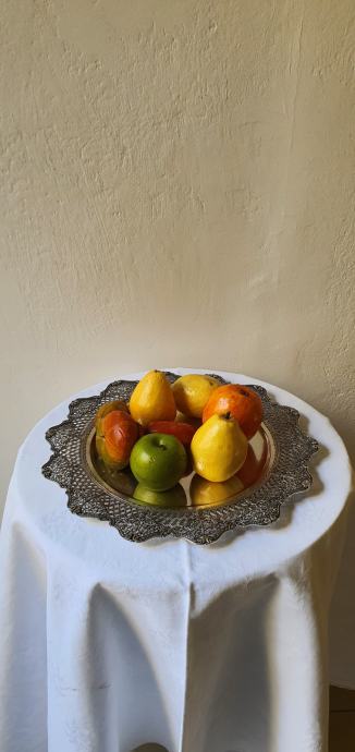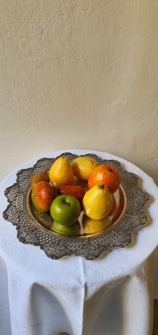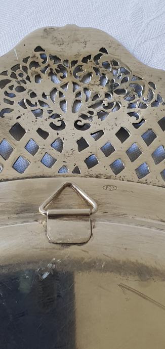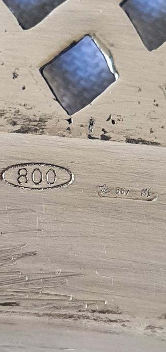 Ručni talijanski rad u srebru 800 zemlja Italija grad Milano utisnuta punca 800 u ovalnom zatim pravokutni žig sa zvjezdicom brojem i oznakom ML za (Milano) vrijeme nastanak prva polovina 20 stoljeća - na pozadi do žiga je i trokutić pa tako može bit i ukras na zidu dok se ne upotrebljava jer je vrlo reprezentativna srebrnina