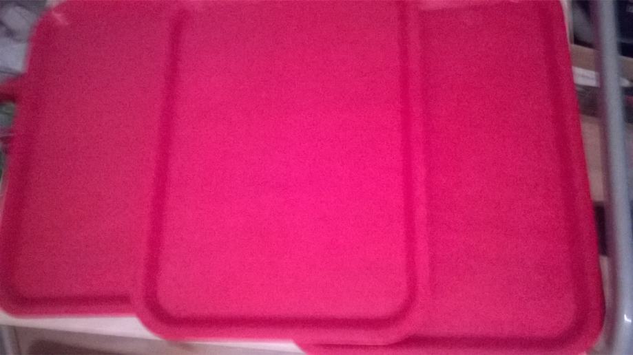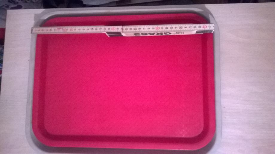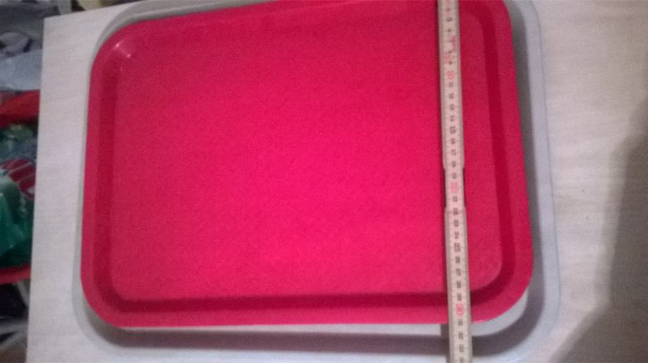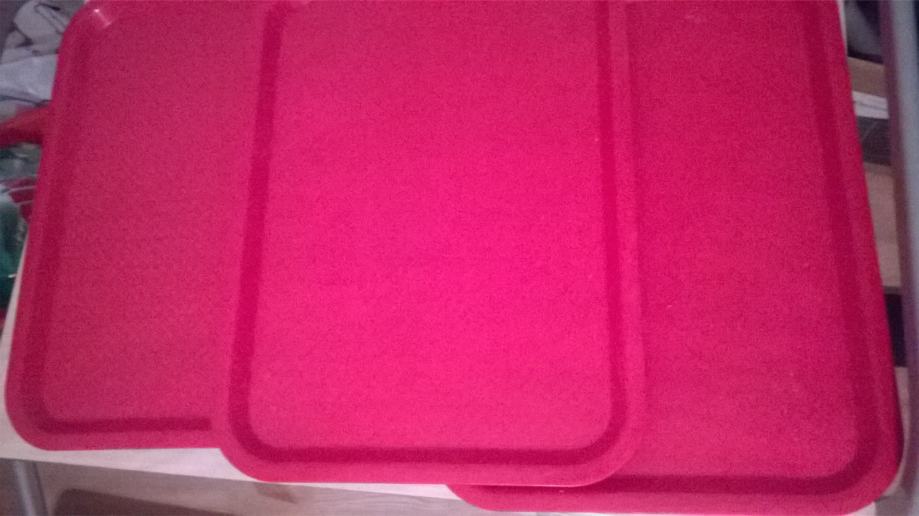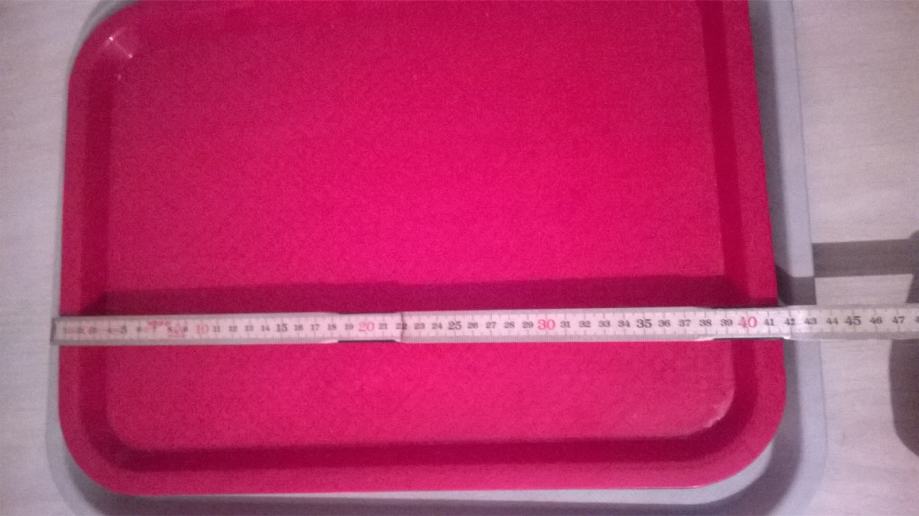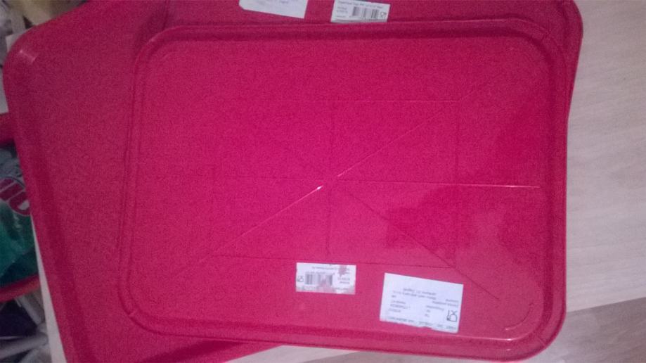 Smeđa duzine oko 45cm i tri crvene duzine 40 cm duboke 2cm. Lako se odrzavaju jer su glatke a ne klize se suđe imaju protuklino dno.