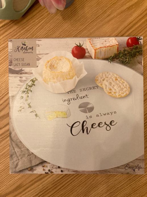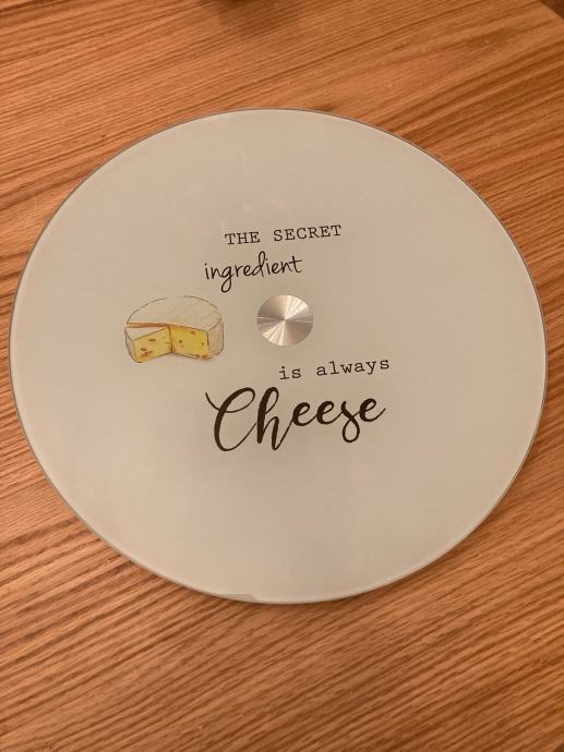 Tanjur za sir s natpisom, napravljen od stakla. Može se okretati (lazy susan tanjur). Promjera 32 cm. Ima 4 gumene nogice za stabilnost.
