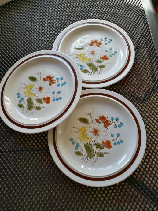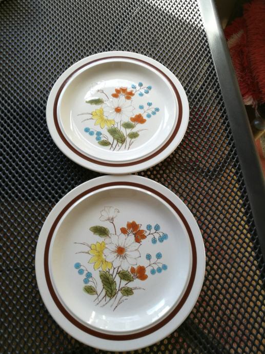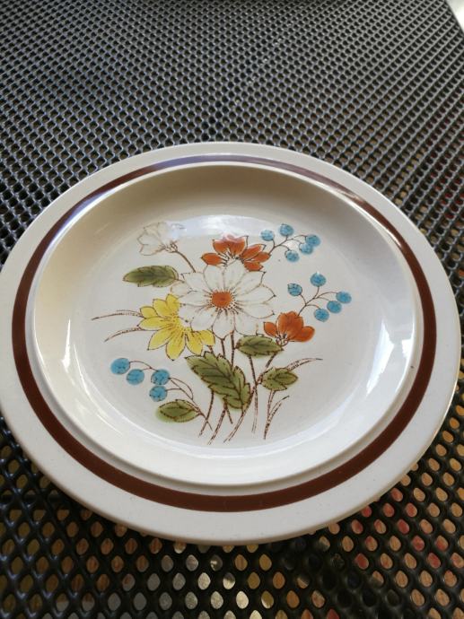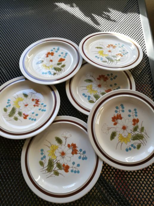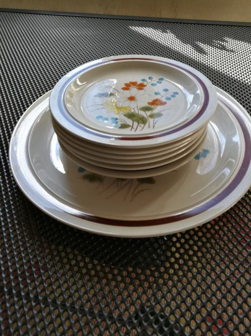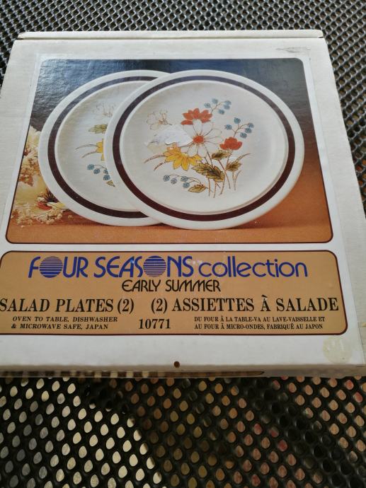 Vintage pladanj sa 6 tanjura za posluzivanje marke Four Seasons collection iz Japana,uzorka Early Summer izrađeni od materijala Stoneware.Tanjuri su nježne krem boje rukom oslikani (hand painted) ljetnim cvijećem u plavoj,žutoj,zelenoj i boji hrdje.Mogu se prati u perilici posuđa,upotrebljavati u standardnoj kao i u mikrovalnoj pećnici.Veliki pladanj za posluzivanje je promjera 31,5 cm dok su tanjuri od 19,5.Pakirani su u originalnim kutijama.Dostava nije uračunata u cijenu. Za područje Zagreba dostavu vršim osobno.