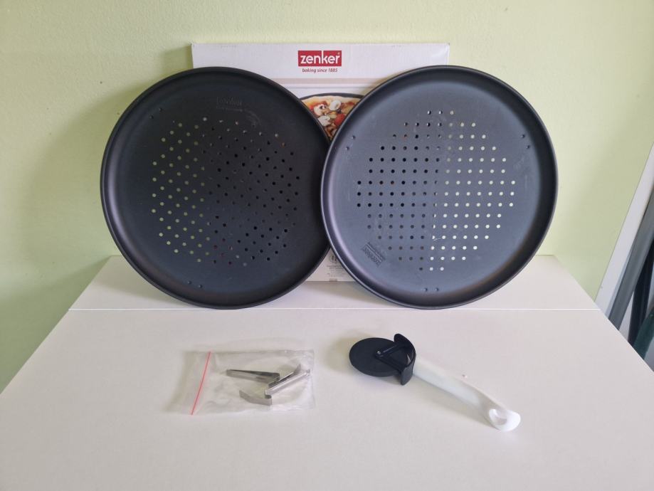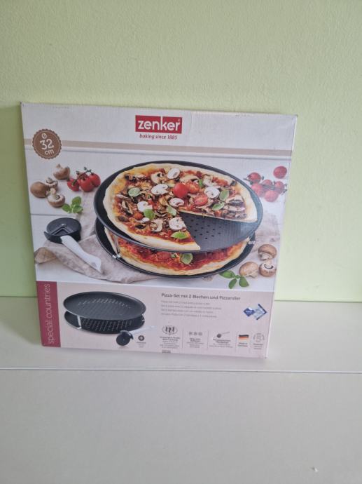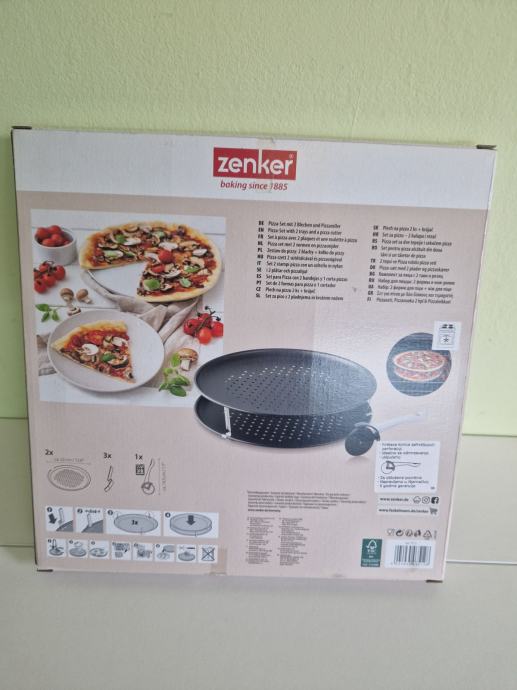Prodajem Zenker set za pečenje pizze, sastoji se od 2 ploče promjera 32cm, sa odstojnicima i rezačem za pizzu. Korišteno svega 2 puta, bez oštećenja, u original kutiji.