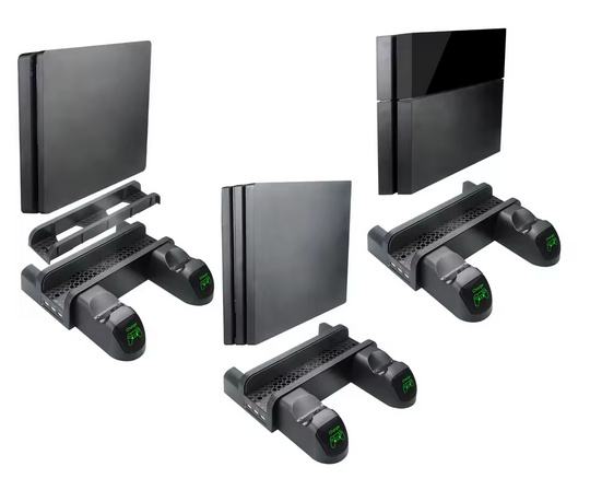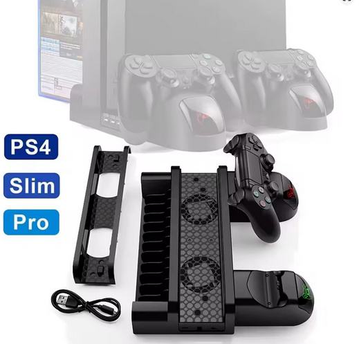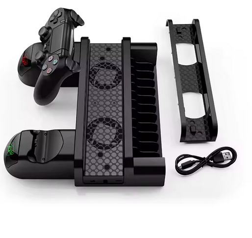 Prodajem multifunkcionalni PS4 stalak s ventilatorima, namijenjen za PlayStation 4 / PS4 Slim / PS4 Pro. Omogućuje hlađenje konzole, punjenje dva kontrolera i uredno spremanje igara – sve u jednom.