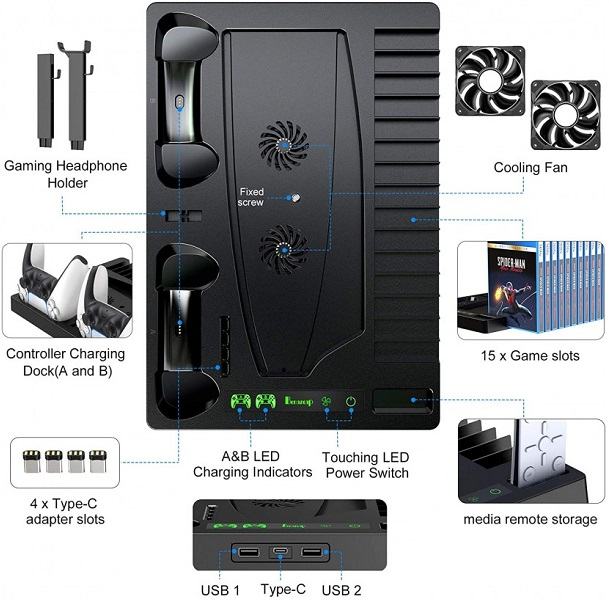 Dodaci za višenamjensko okomito postolje za PS5: Sve u jednom postolje za PlayStation 5, koje može ostvariti više funkcija. ventilator za hlađenje konzole PS5; Na bočnoj strani nosača nalazi se 15 utora za kartice za pohranjivanje diskova s igrama od 15 komada; 2 postolja za punjenje za PS5 kontroler; Stalak za pohranu može staviti slušalice; s 2 LED indikatora + 2 USB A izlazna priključka + 1 izlazni priključak tipa C.