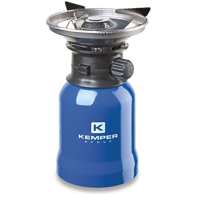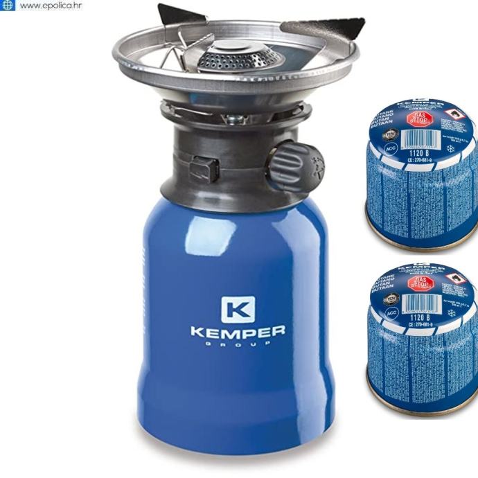Plinsko kuhalo na kartušu 190 gr u plavoj izvedbi sa zaštitom od vjetra i piezo upaljačem. Koristi kartušu KEMPER 1120s1. Idealno za kampere.