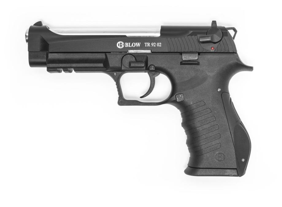 Startno-plinski pištolj u crnoj boji sastoji se od polimernog okvira i metalne navlake.