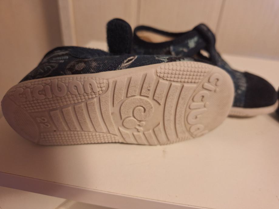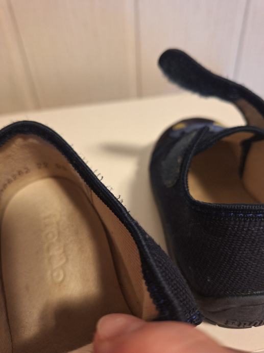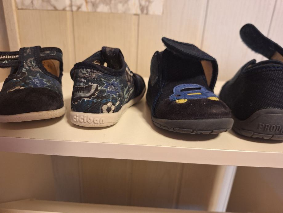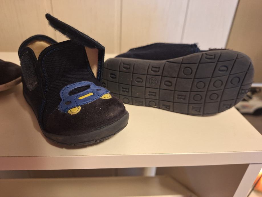 Prodajem dva para dječjih papučica u plavim tonovima. Jedan par je marke Ciciban s printom u stilu dinosaura i čičak zapučanjem, a drugi par je tamnoplav s aplikacijom autića i gumenim ojačanjem na nožnim prstima. Uz papučice dolazi i slon plišanac.