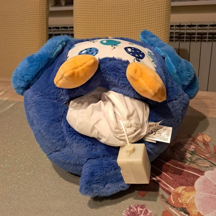 Na leđima ima tipkicu koja, kad je klikneš, svira sretan rođendan na engleskom. Idu baterije 1.5V AAA.
