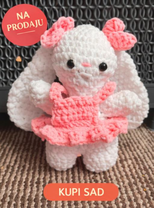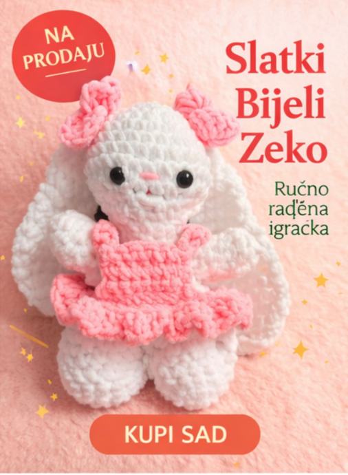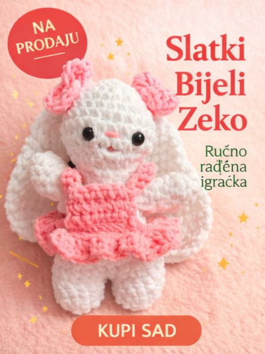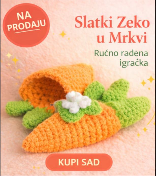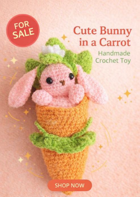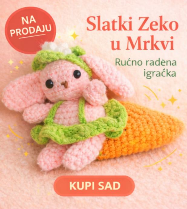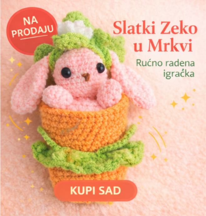 Prodajem ručno rađene plišane igračke od heklanja koje su trenutno dostupne i spremne za narudžbu. U ponudi se nalaze nekoliko različitih modela: slatki ružičasti zeko koji viri iz narančaste mrkve s detaljima zelenog lišća, set narančastih mrkvi s bijelim cvjetićima, te bijeli zeko u rozi haljinki s mašnom.