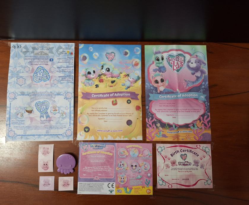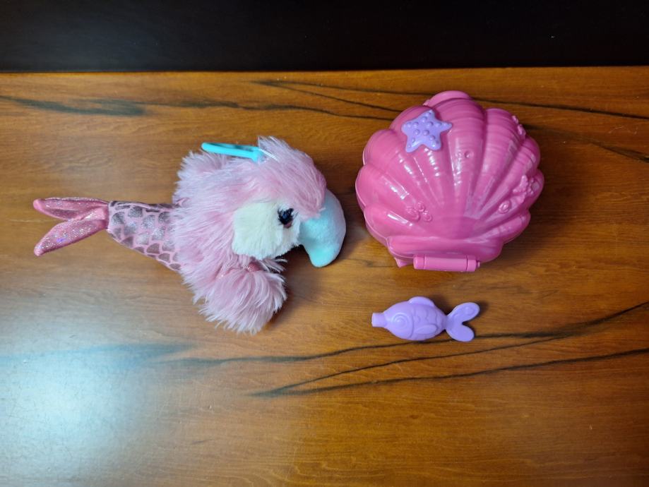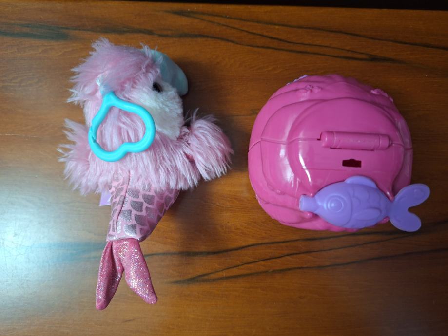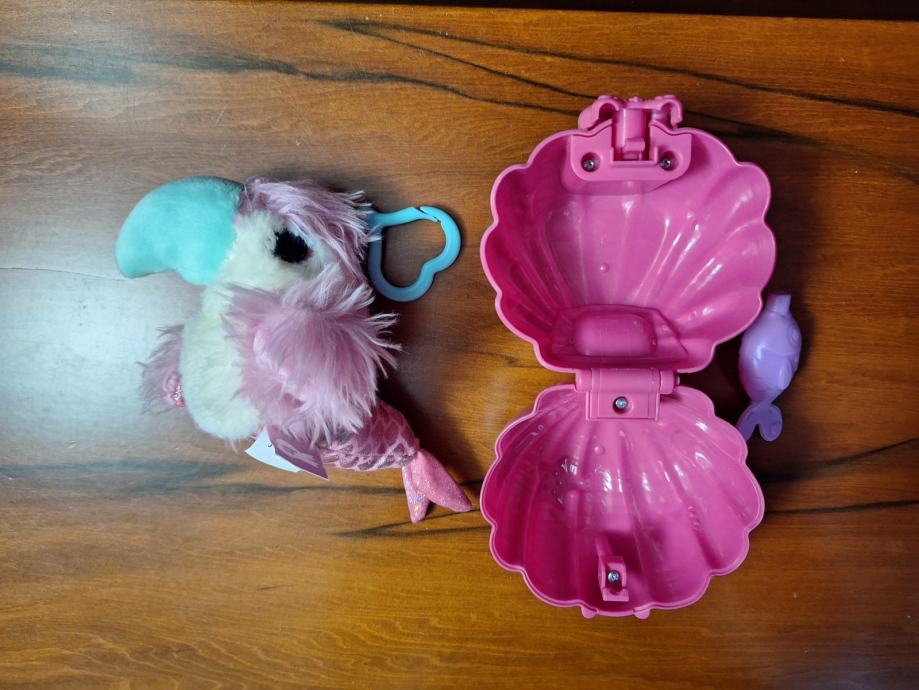 5. Little live pets – Scruff A Luvs Mermaid babies; sirena ptičica (privjesak) koja dolazi uz plastičnu školjku koja se otključava ribicom, ribicom za otključavanje, certifikat o posvajanju i češalj.