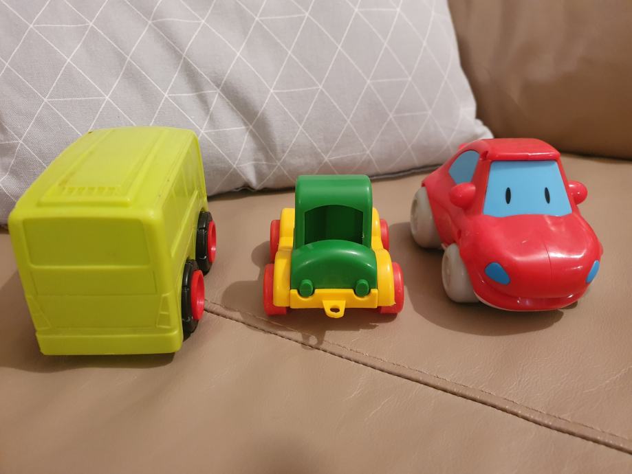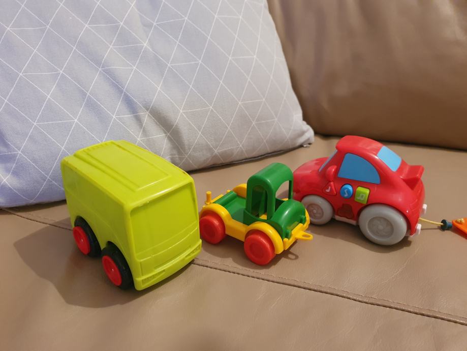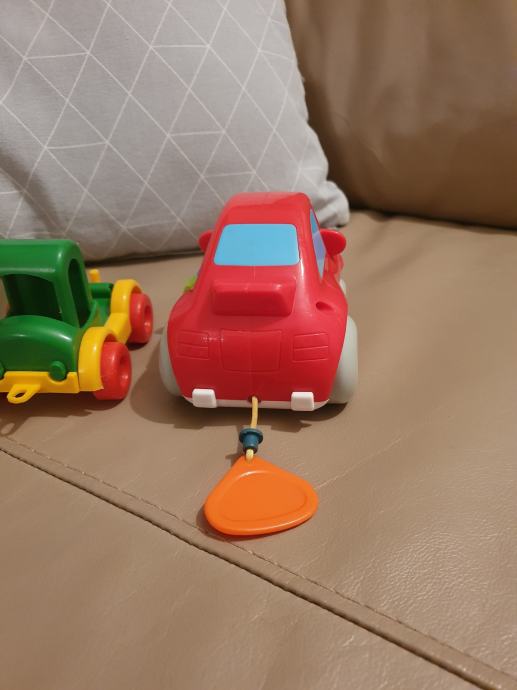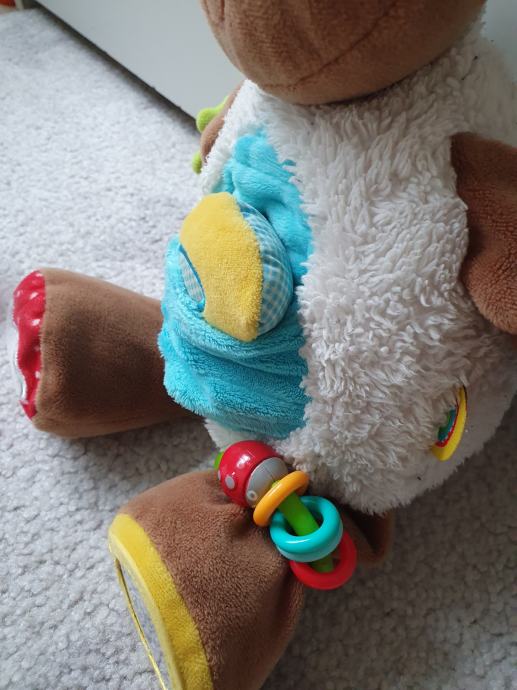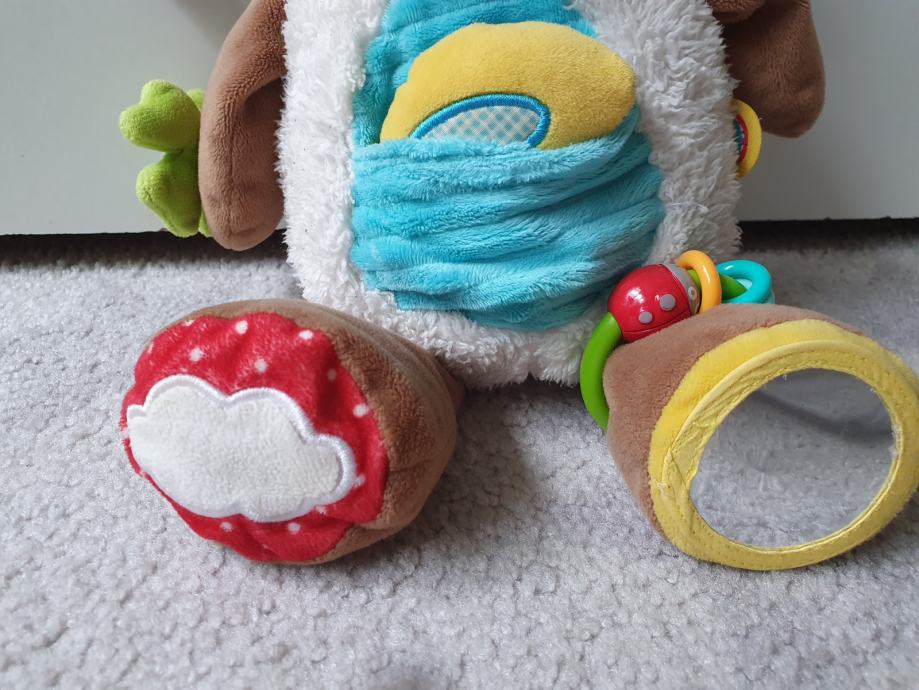 Ima zvečkicu oko noge, ogledalce, šuškalica uho, u trbuščiću ima pilića koji se potegne pa vibrira i ponovno uvuče, na rukici nažalost djetelina je na pritisak svirala no nakon pranja više ne radi, sve ostalo bez oštećenja.