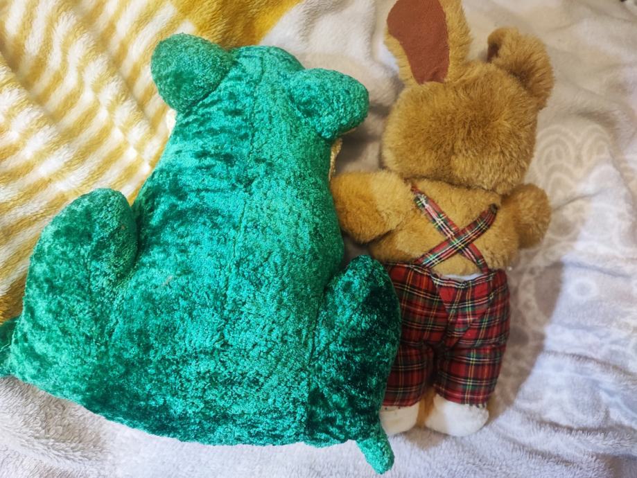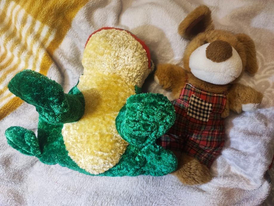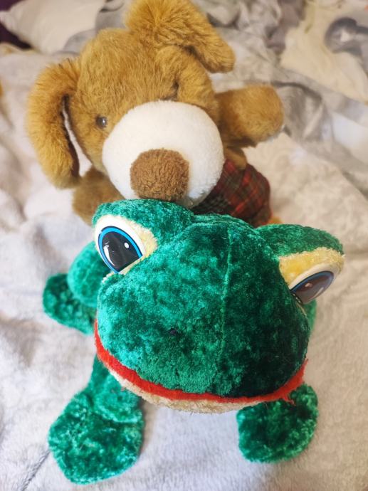 Plišane igračke u jednom lotu, žaba i pas, visina 26 cm.