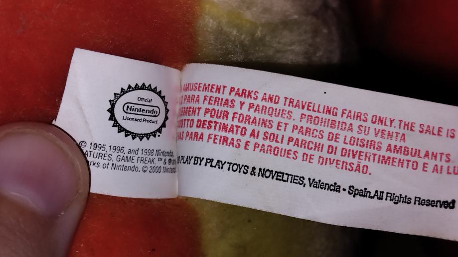 Nažalost nema etiketu ali je po izradi očito da je riječ o originalu, imala sam prije jednu istu takvu sa etiketom i pisalo je Nintendo original. Slike etikete sa ovog oglasa su od prijašnje plišane koju više nemam, ovaj Charmander NEMA etiketu!