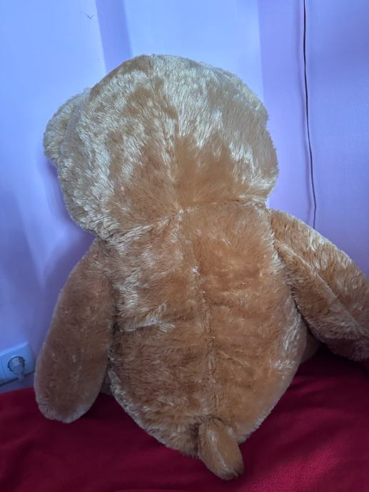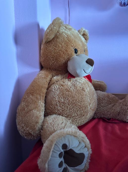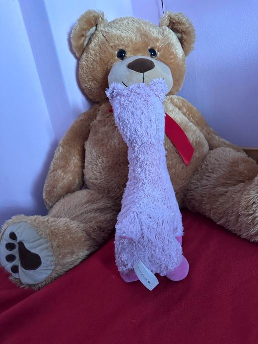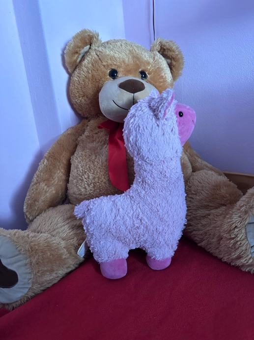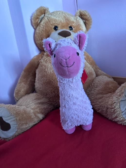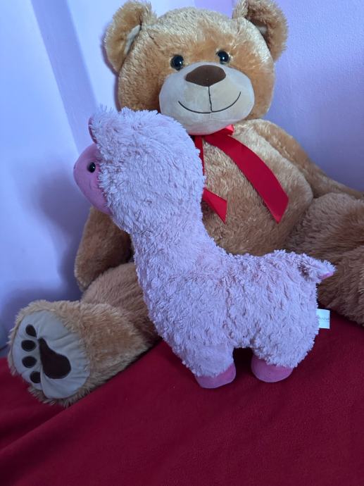 Poklanjam plišanog medvjeda i plišanu ljamu. Medvjed je veće veličine, smeđe boje s crvenom mašnom oko vrata.