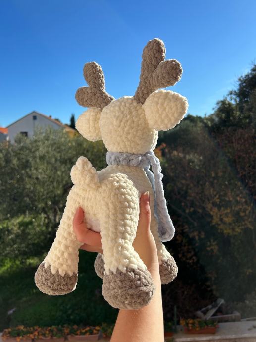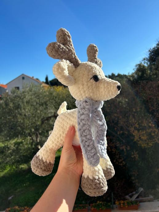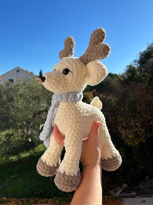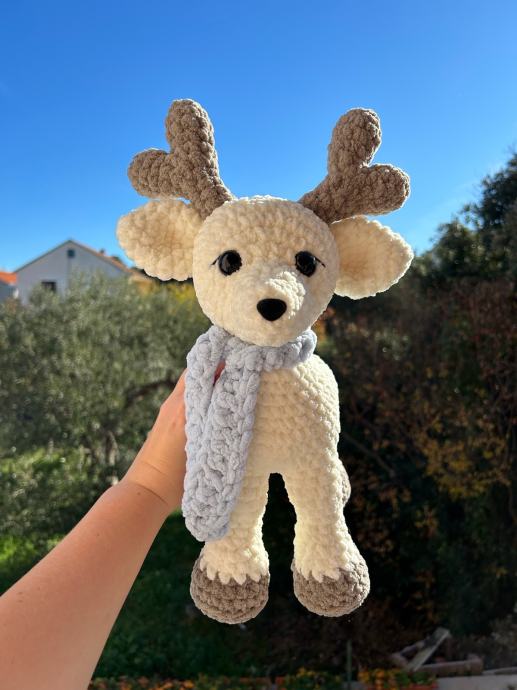 Ručno heklani plišani jelen sob s plavim šalom