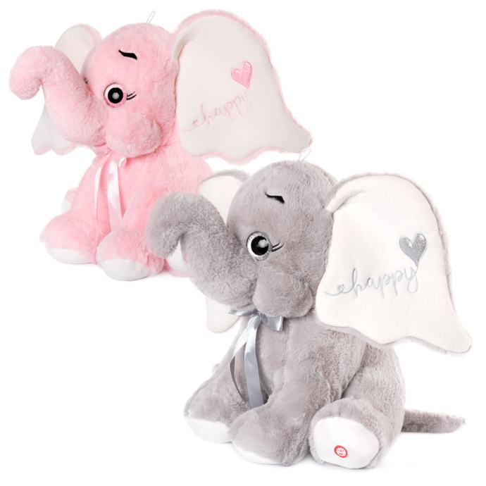 Plišani slon sa zvukom od 55 cm je slatka plišana igračka koja dolazi sa zvukom i natpisom "Happy". Ovaj slon plišanac ima simpatičan izraz lica s velikim okruglim očima i velikim ušima što ga čini privlačnim i popularnim među djecom.