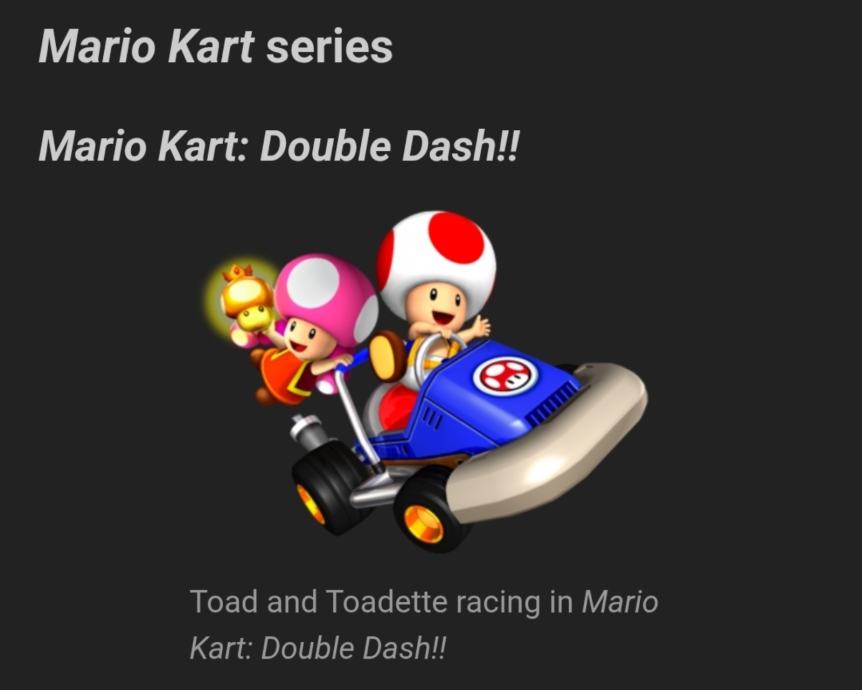 Lik Toadette se prvi put pojavljuje u igri Mario Kart Double Dash!! 2003 godine.