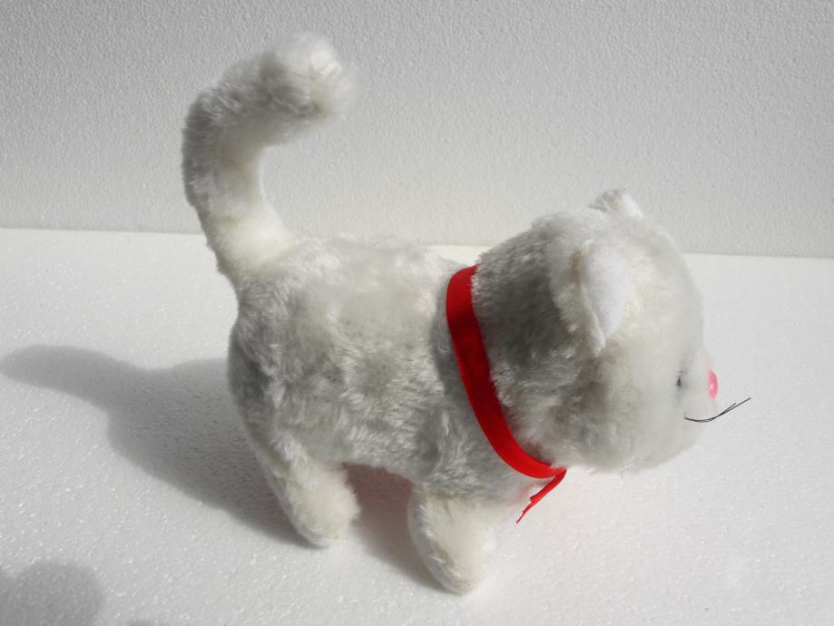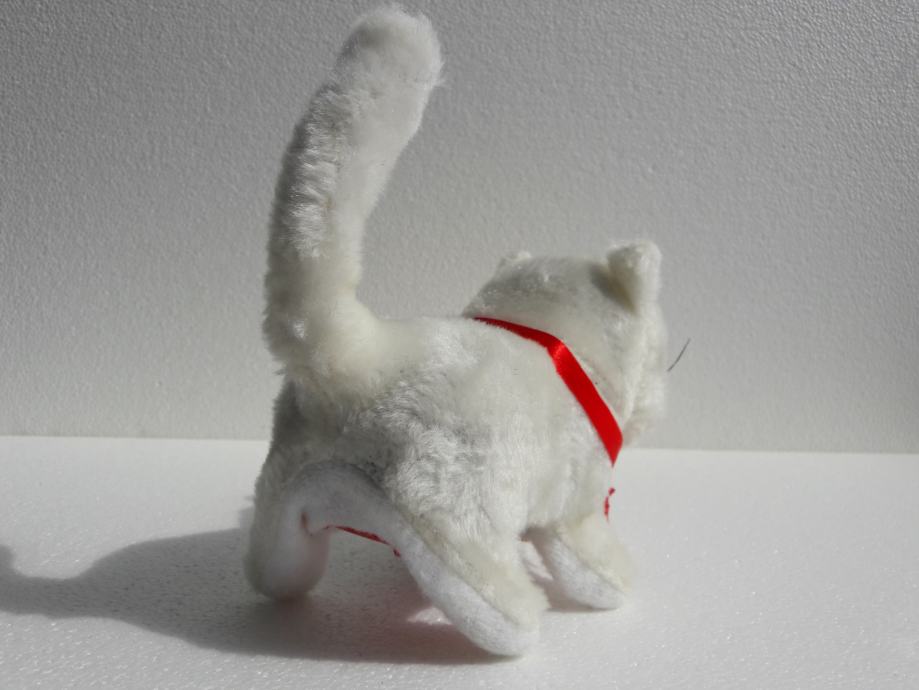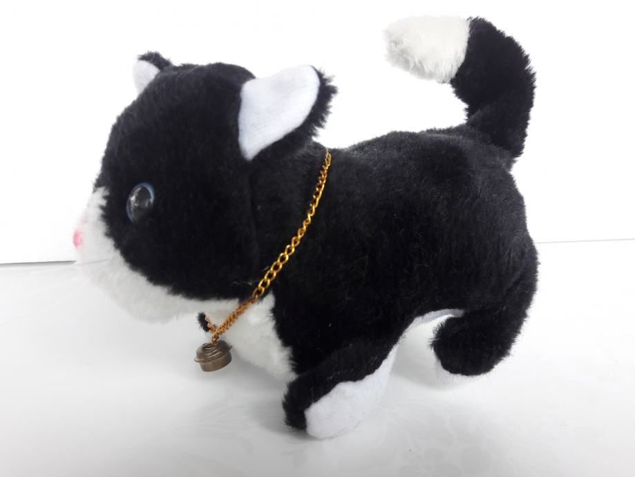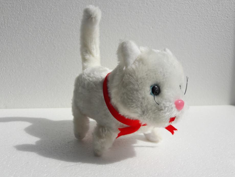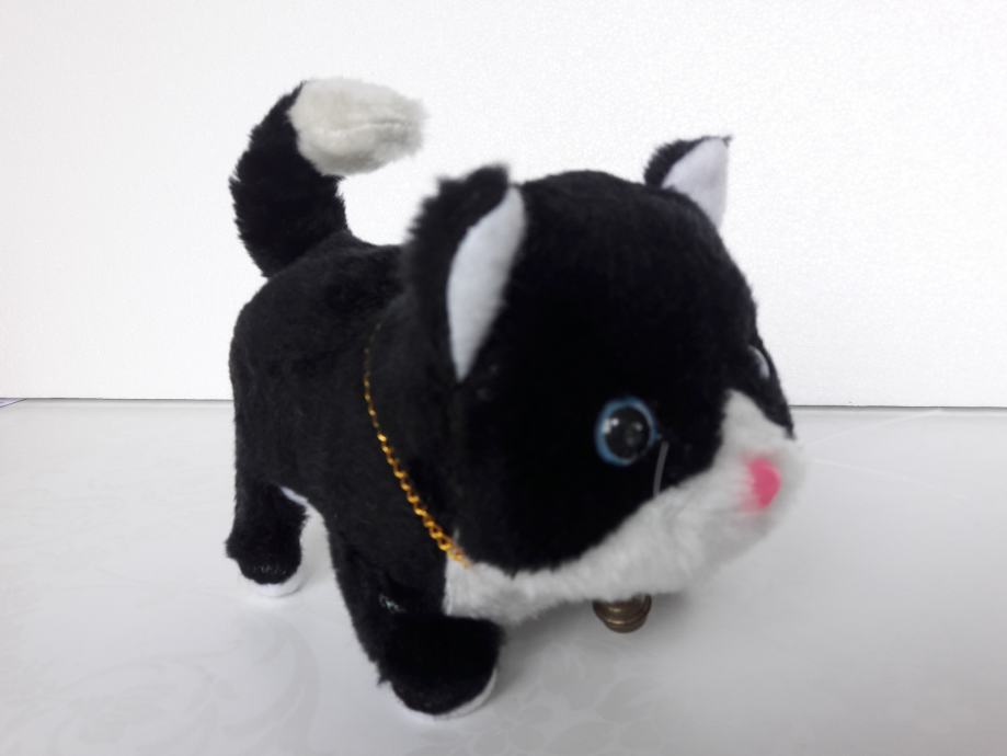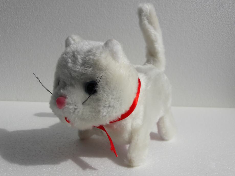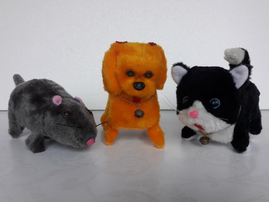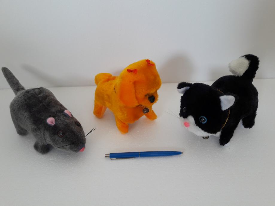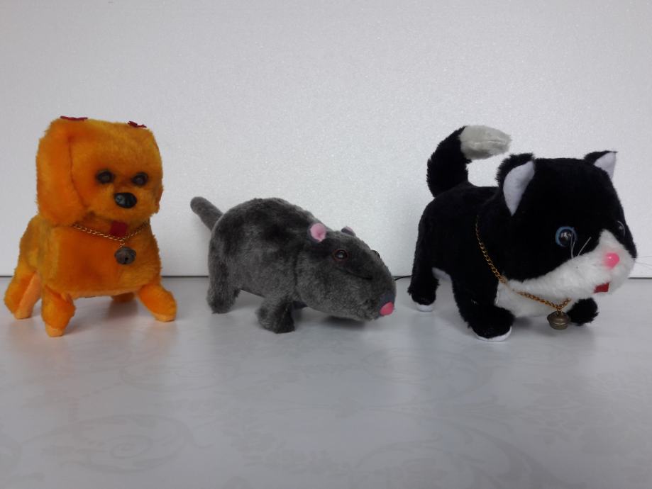 Tri nove plišane životinje – pas, mačka i miš, prodajem. Pas laje, mačka mijauče, miš cijuče i sve tri životinje hodaju naprijed i oči im svijetle. Pas se diže na stražnje noge. Sve životinje se pokreću na baterije.