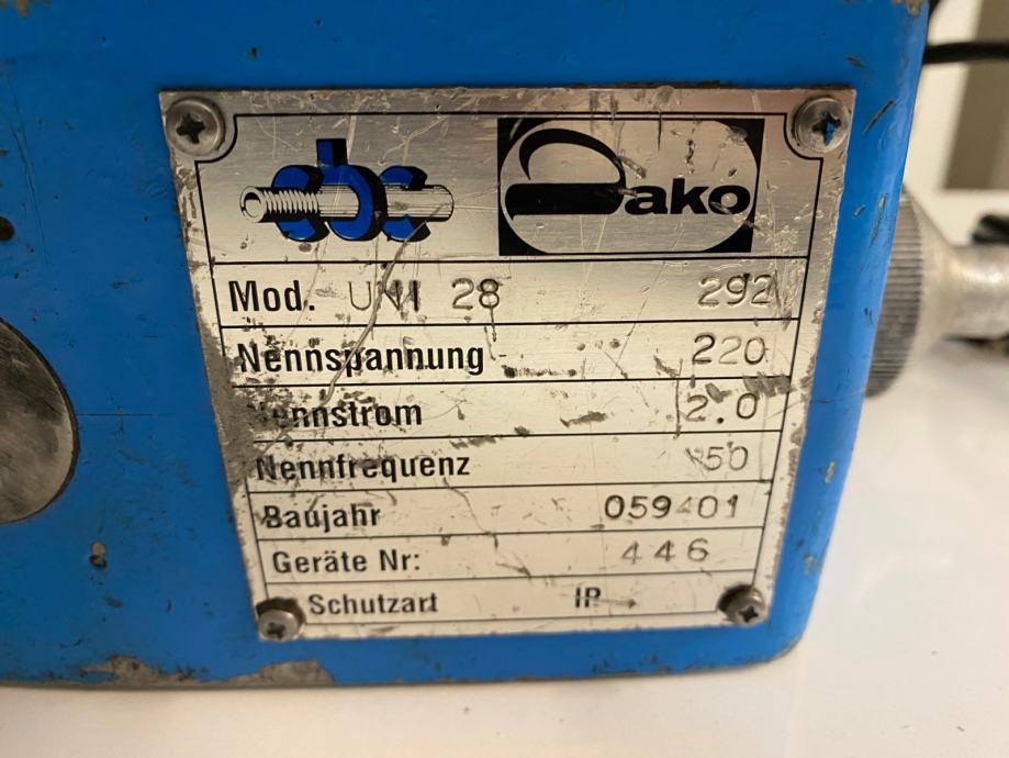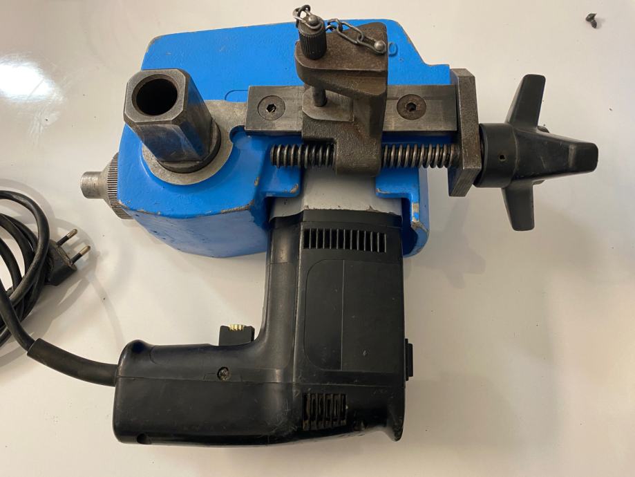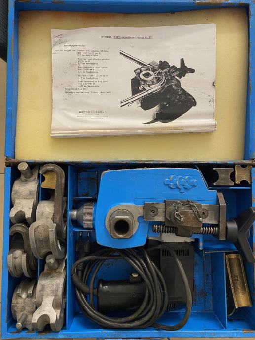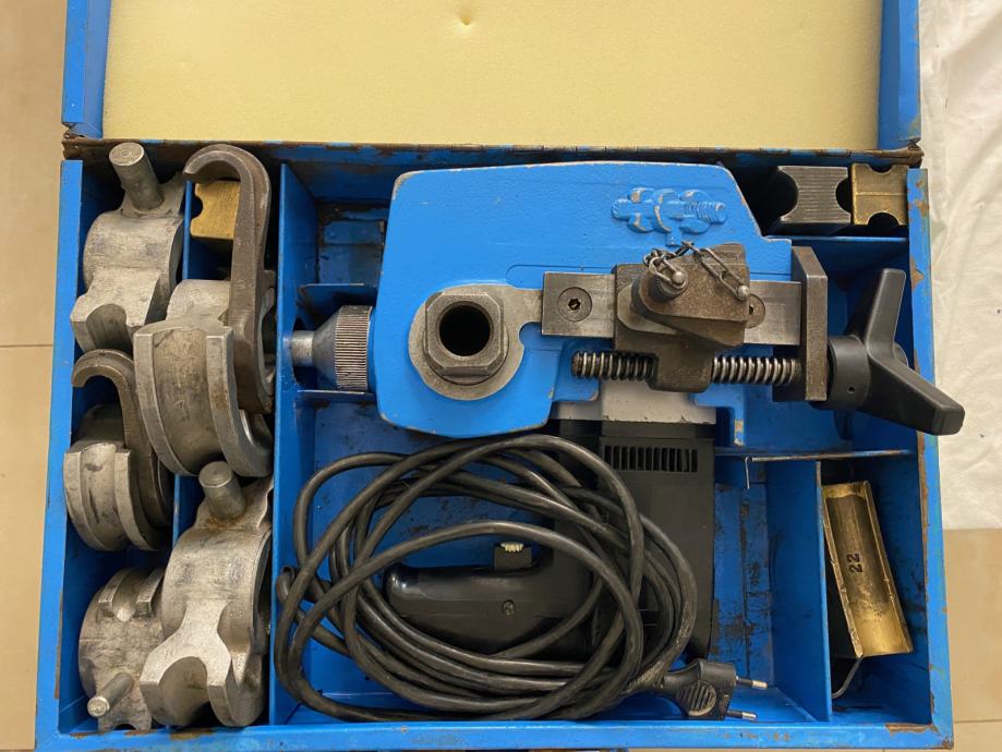Odličan mali stroj za krivljenje cijevi i profila, talijanske proizvodnje CBC UNI 28. U potpunosti funkcionalan, sa 5 alata za krivljenje cijevi. 220V; 400W, sa mogućnošću namještanja brzine savijanja. Stroj je jako kompaktan, za inox cijevi do Ø28x1,5 mm ili 3/4"G, ukupne težine oko 10 kg, pogodan za jednostavan rad na terenu. Ponuda uključuje stroj, 5 alata sa klizačima, kontravaljak, uputstvo za uporabu na njemačkom, sve u originalnom transportnom kovčegu.