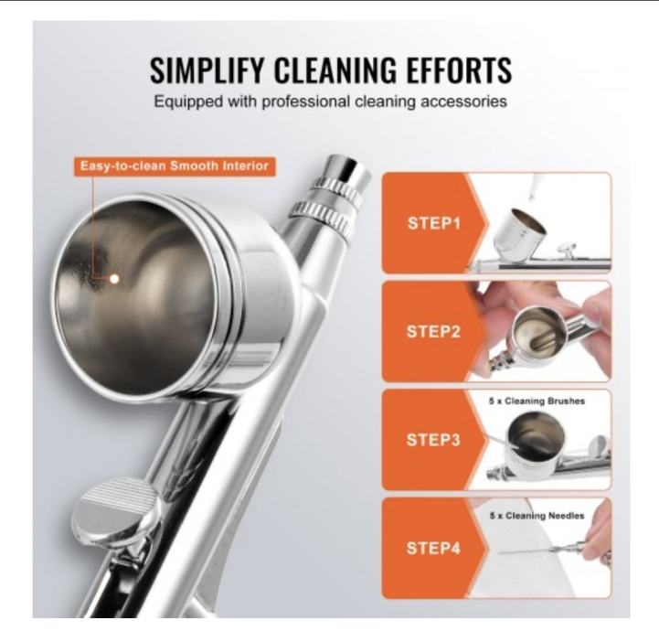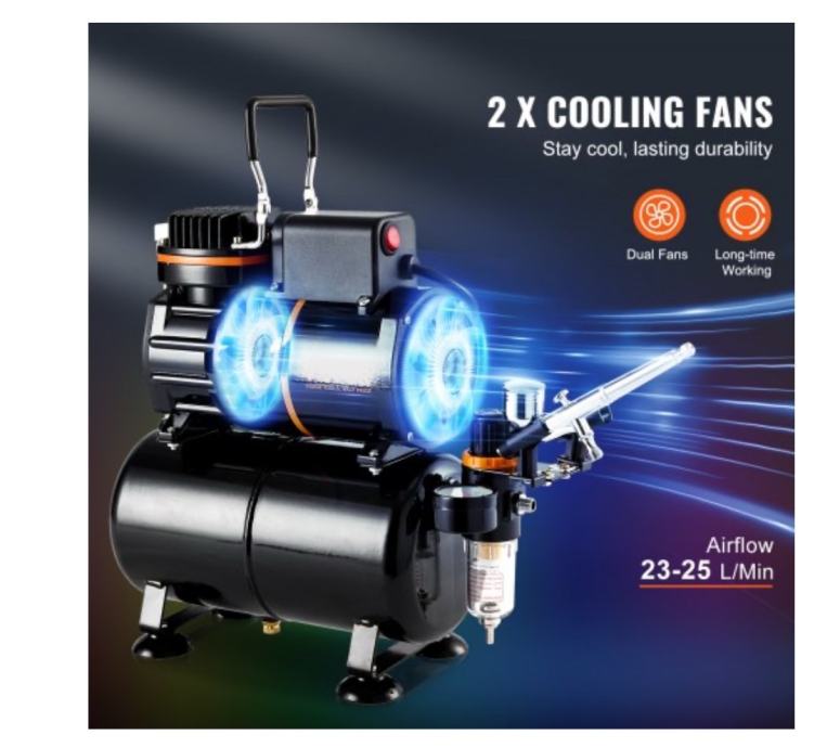Opremljen s 2 ventilatora za hlađenje s protokom zraka od 23 do 25 l/min, naš set zračnih četkica pruža izvrsne performanse hlađenja tijekom dugotrajne upotrebe, a istovremeno štiti stroj od pregrijavanja. Stroj radi stabilno i tiho pri 47 dB, osiguravajući ugodnije iskustvo prskanja.