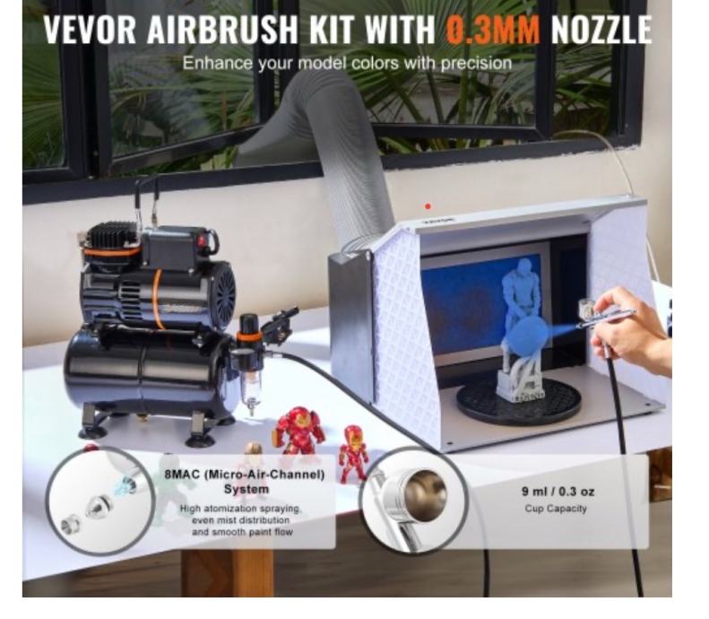 Veličina od 0,3 mm savršena je za rukovanje malim predmetima i detaljno prskanje. Profesionalni 8MAC (Micro-Air-Channel) sustav omogućuje visoko mikronizirano prskanje i osigurava savršeno raspršivanje i preciznu kontrolu prskanja. Naš set zračnih četkica s kompresorom osigurava glatko iskustvo prskanja.