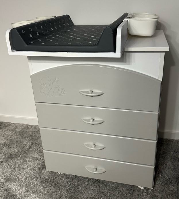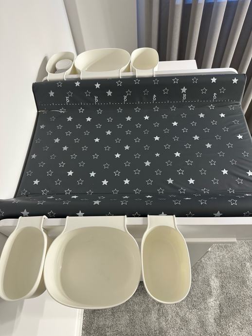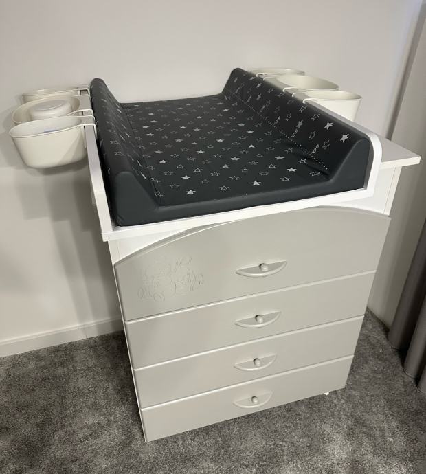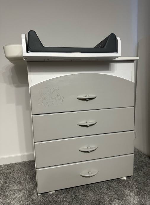 Komoda ima kotače i 4 prostrane ladice, a na vrhu je pomični dio za previjanje sa spužvastom podlogom (koja se može mijenjati). Komoda je rabljena, ali u dobrom stanju, fronte ladica su prelakirane u sivu boju i ima tek neznatna površinska oštećenja. Uz kupnju navedenog poklanjamo i par posuda (IKEA) koje se jednostavno montiraju na previjalicu (za vodu, potrošni materijal, itd.). Ujedno poklanjamo kadicu za kupanje bebe s ugrađenom vagom. Moguće isključivo osobno preuzimanje kod nas na Vrbanima.