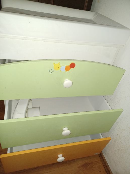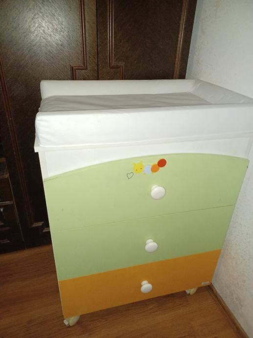 Prodajem malo korišten ormarić za prematanje bebe s tri ladice, podlogom za prematanje i kotačićima.