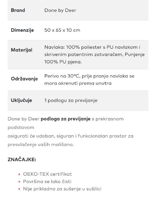 Prodajem podlogu za previjanje brenda Done by deer. Jako malo koristena, kao nova, navlaka ima patent i periva je u perilici. Jako mekan materijal.