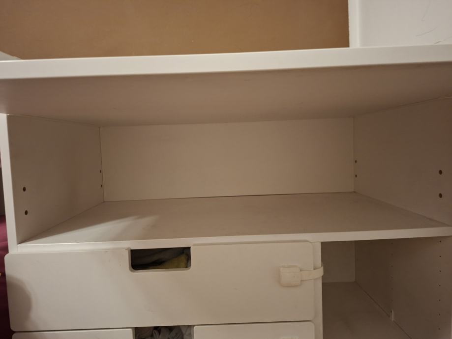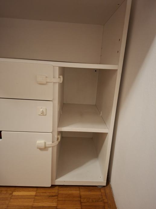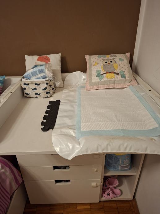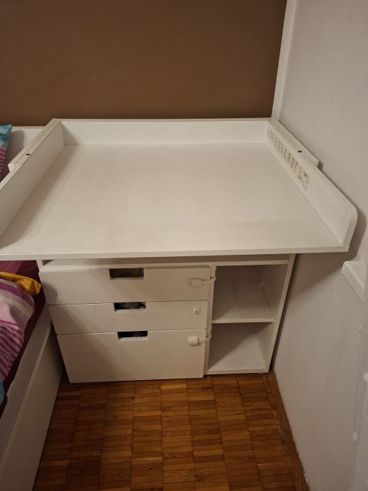 Presvlacilica bijela,IKEA.3 ladice zatvorene,3 otvorene.puno mjesta, a kasnije može biti radni stol,jer se daska moze spustili. Boja bijela,100×90×79.
