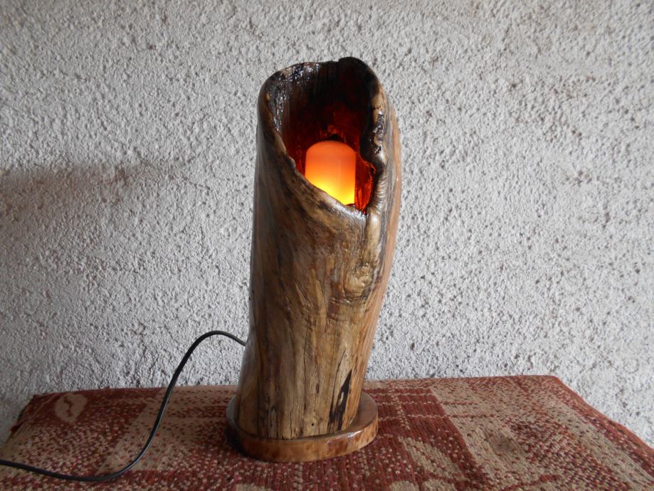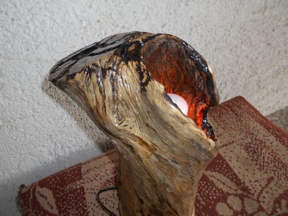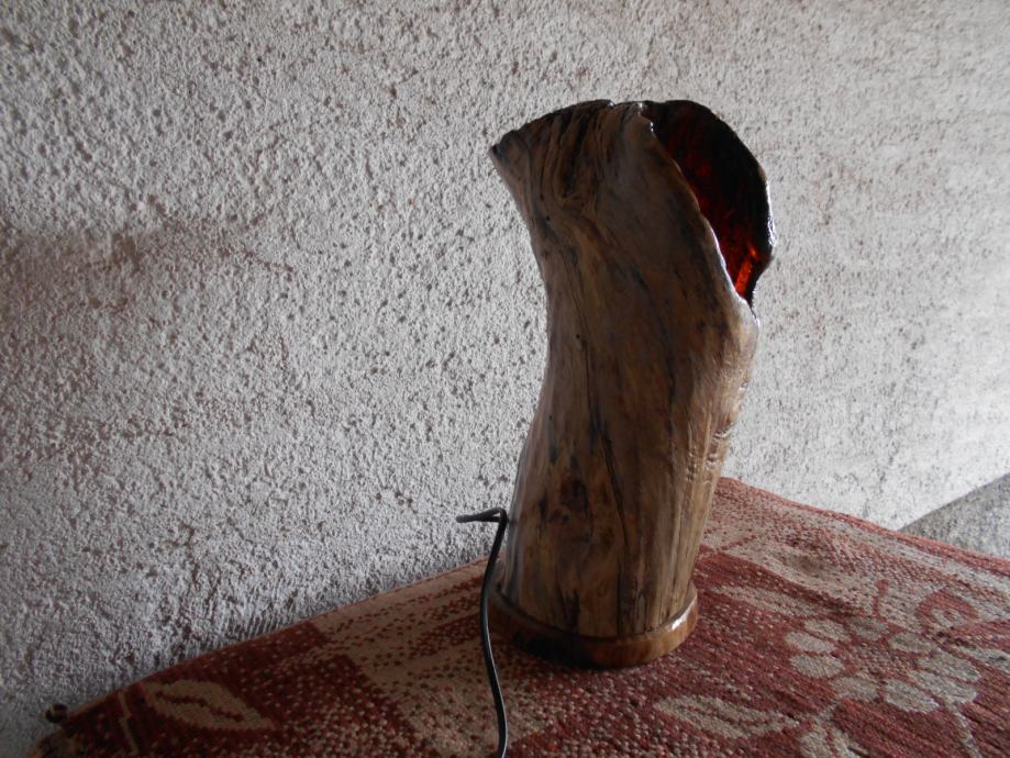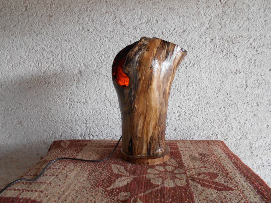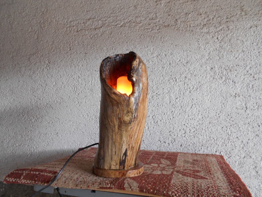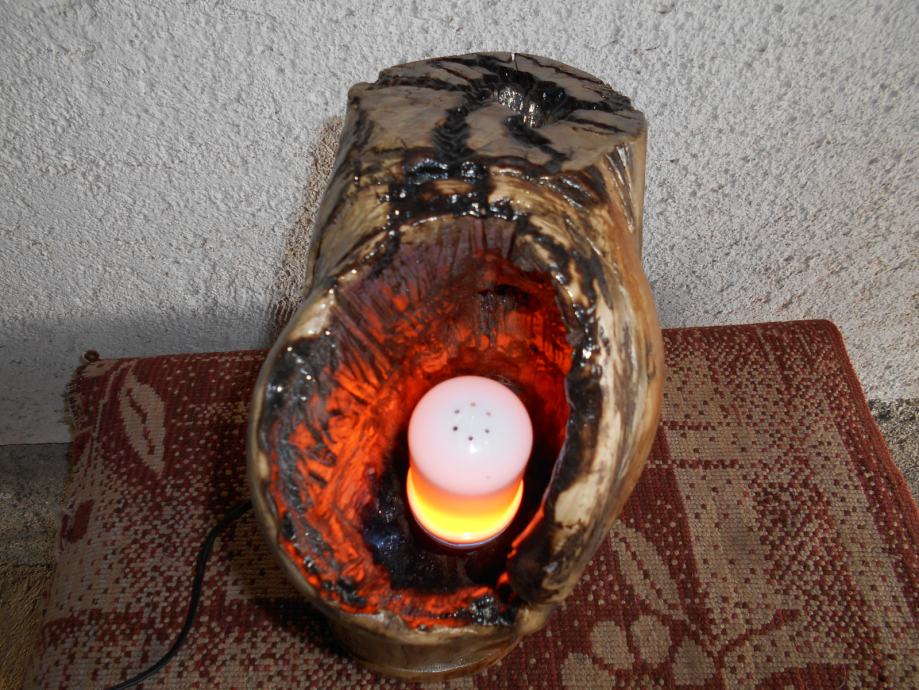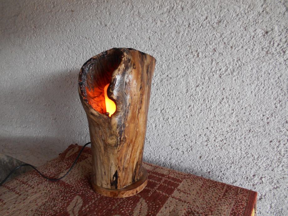 Prodajem lampu sa efektom plamena (vidljivo iz priloženih slika ) .. Napravljena je od suhog klenovog šupljeg drveta , lakirana bezbojnim lakom i ugrađena žarulja koja ima efekat plamena , i još dva moda svijetlosti .. Jedan je stalno svijetlo , a drugi polako se svijetlost smanjiva i pojačava .. Pali se prekidačem na kablu , a može se paliti i daljinski ( sa tim da se kupi utičnica i daljinski upravljač ) ..Visina lampe je 44 cm , obujam 28 cm , a težina 4-5 kg ..