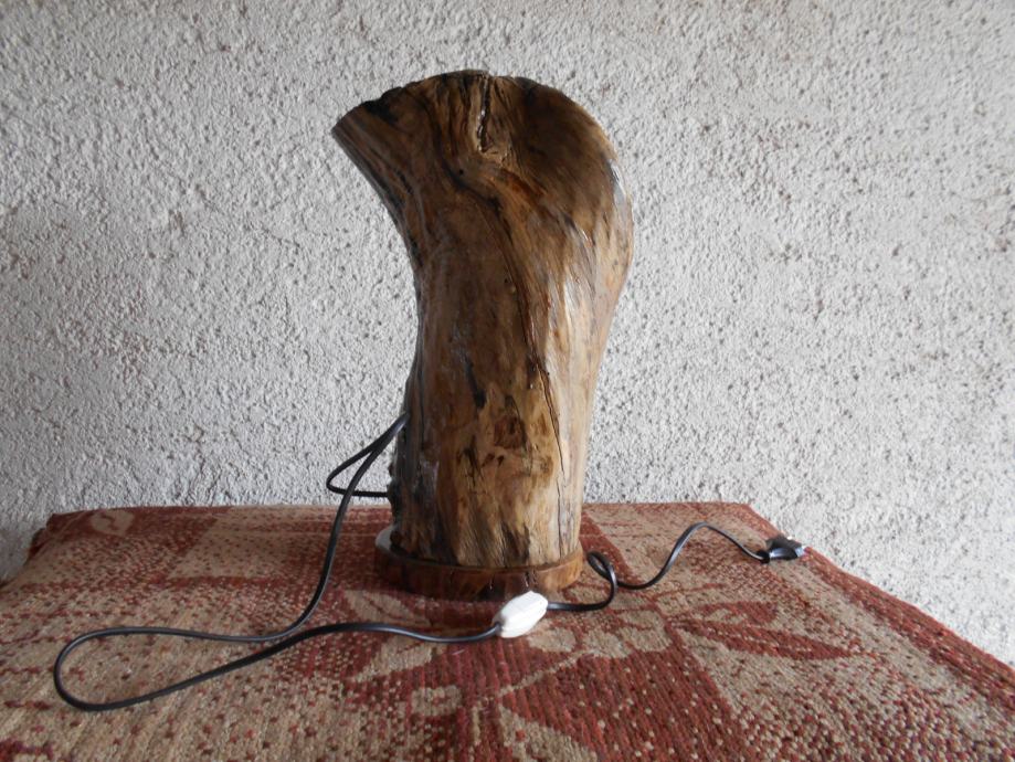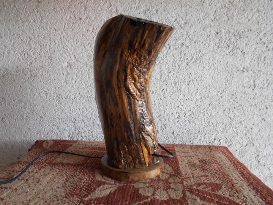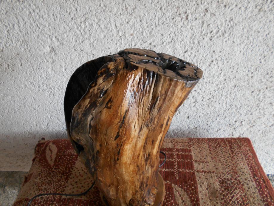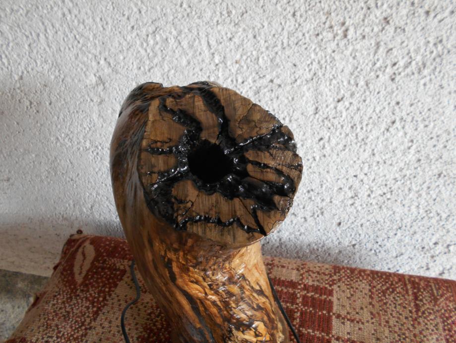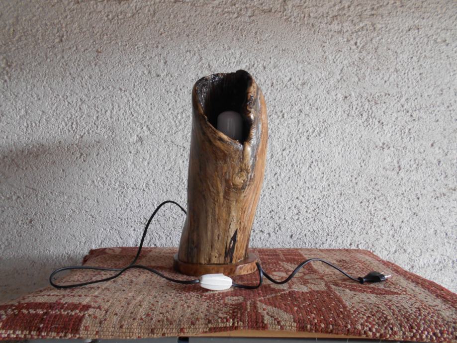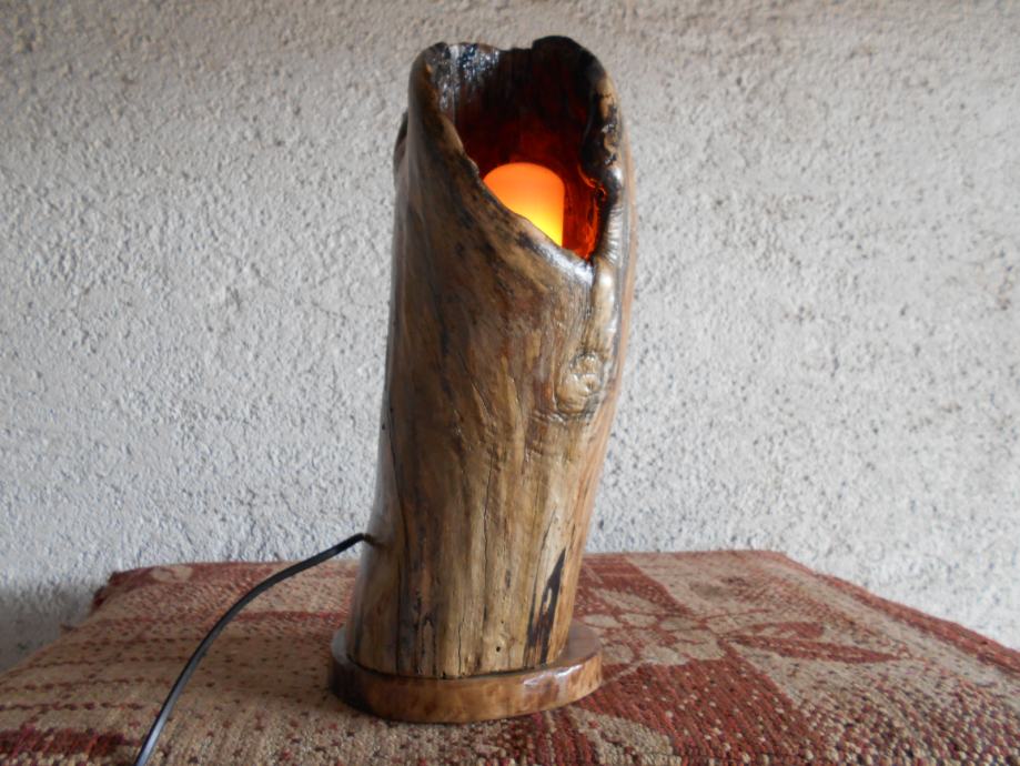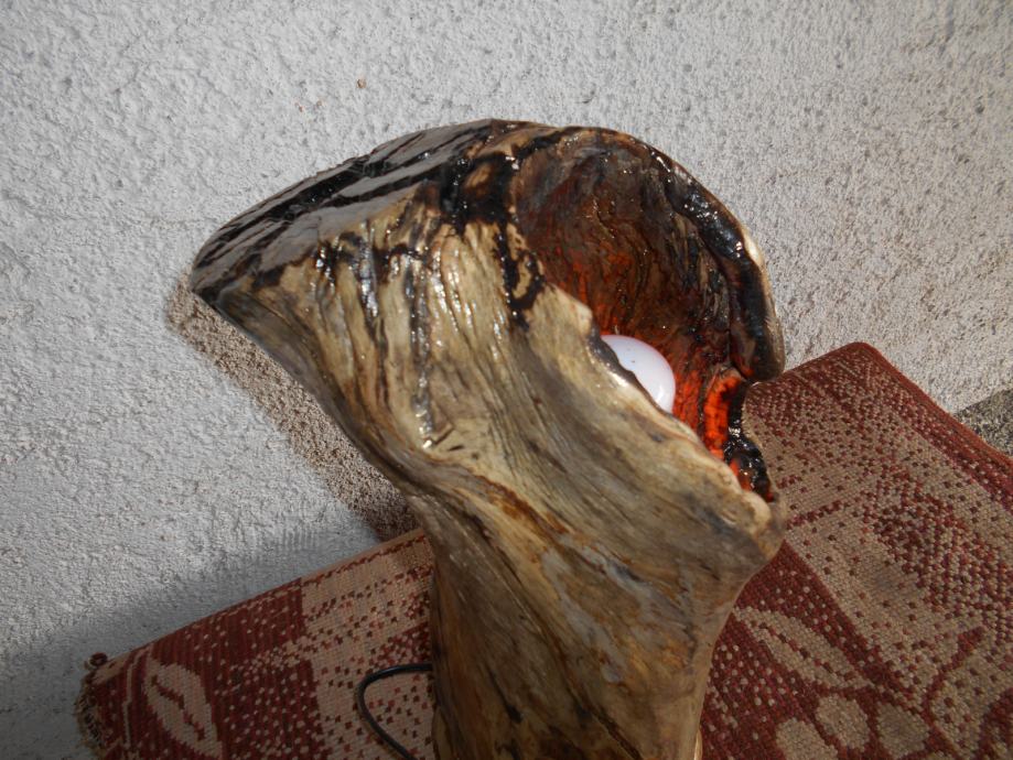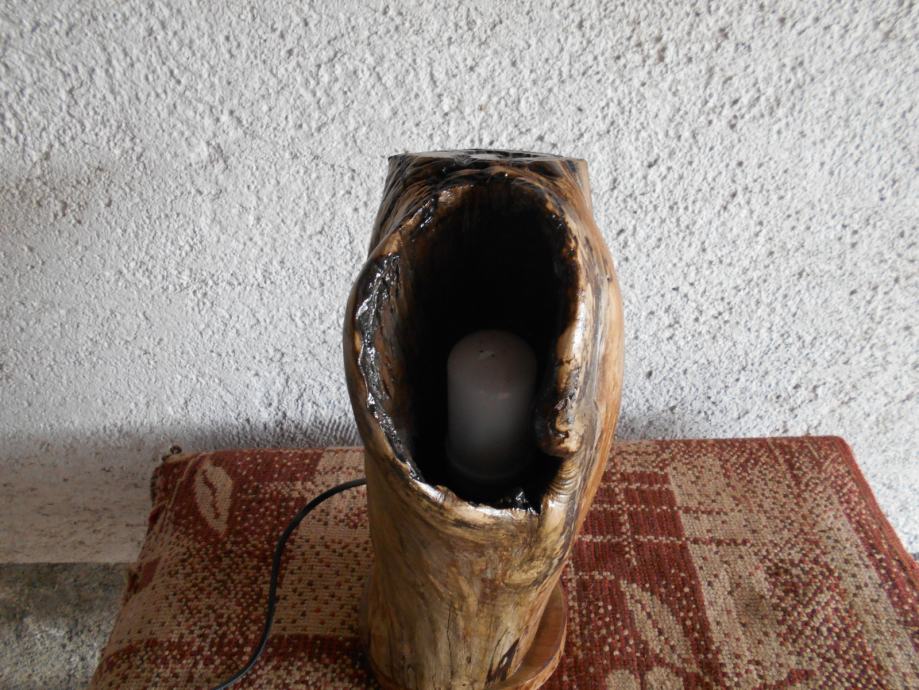 Prodajem lampu sa efektom plamena (vidljivo iz priloženih slika ) .. Napravljena je od suhog klenovog šupljeg drveta , lakirana bezbojnim lakom i ugrađena žarulja koja ima efekat plamena , i još dva moda svijetlosti .. Jedan je stalno svijetlo , a drugi polako se svijetlost smanjiva i pojačava .. Pali se prekidačem na kablu , a može se paliti i daljinski ( sa tim da se kupi utičnica i daljinski upravljač ) ..Visina lampe je 44 cm , obujam 28 cm , a težina 4-5 kg ..