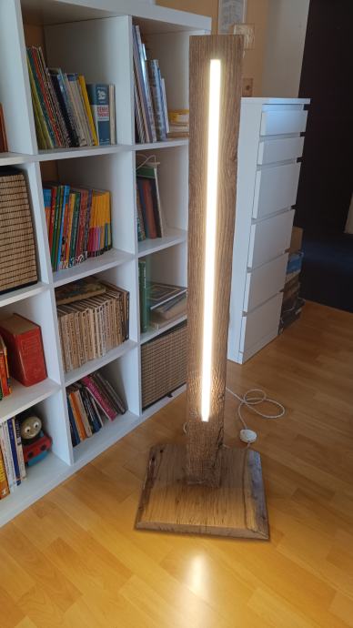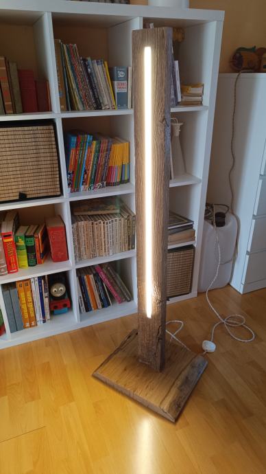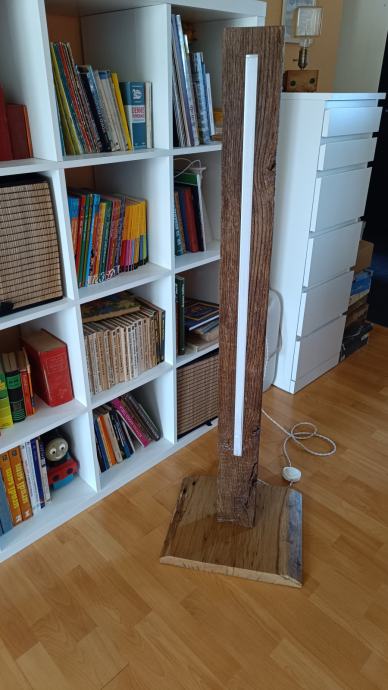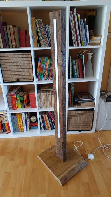 Podna lampa napravljena od stare hrastovine. Drvo je premazano uljem i ugrađena je LED COB traka u aluminijski profil sa mat poklopcem. Visina lampe je 135 cm, a dužina LED COB trake je 100 cm. Trafo je ugrađen u tijelo lampe sa zadnje strane. Spojni kabel je tekstilni, frkani dužine 3 m, sa ugrađenim podnim prekidačem.