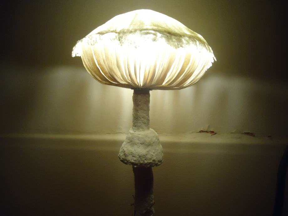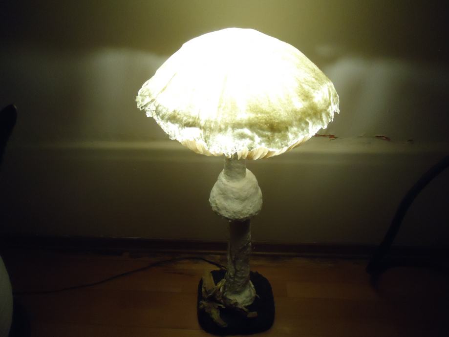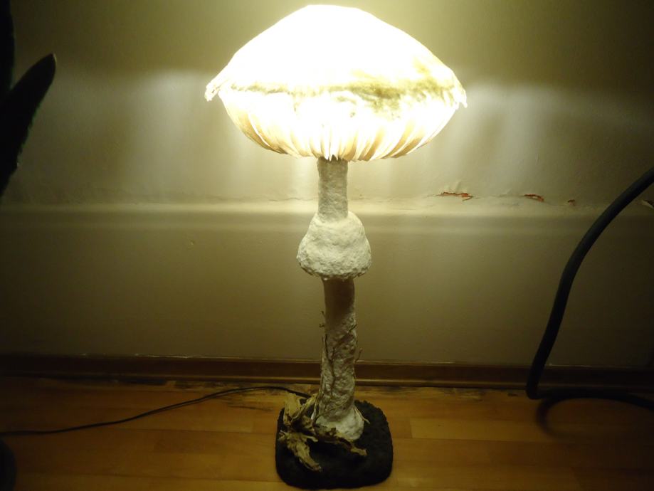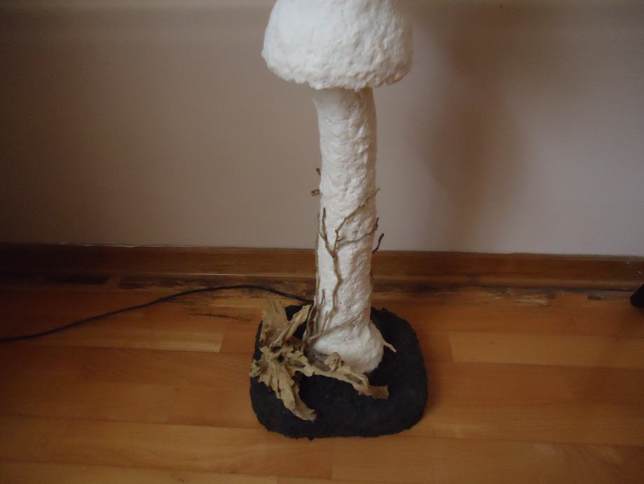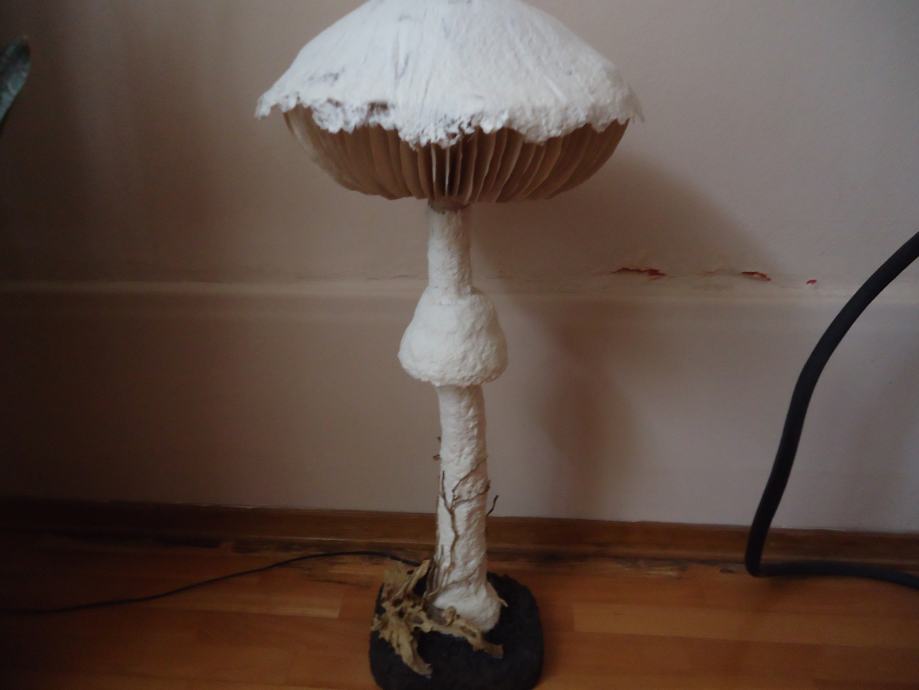 Unikatna podna lampa u obliku gljive, promjera 30 cm i visine 85 cm, u potpunosti ručni rad, izrađena od drveta, žice i kaširanog papira.