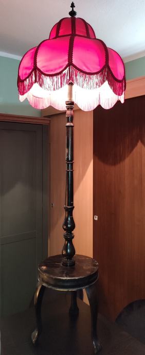 Lampa kombinira funkcionalnost rasvjete s praktičnom stolicom za odlaganje sitnica, što je karakteristično za starije dizajne podnih lampi. Cijela konstrukcija je stabilna i solidno izrađena, s tamnom drvenom završnom obradom.
