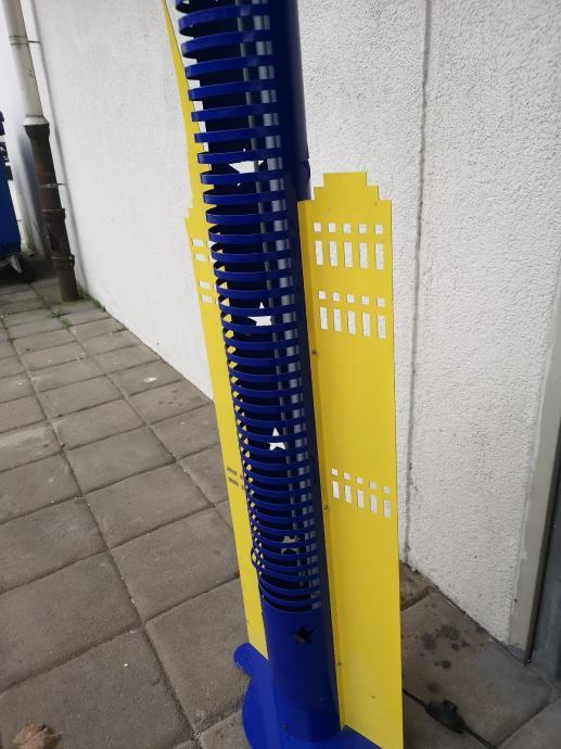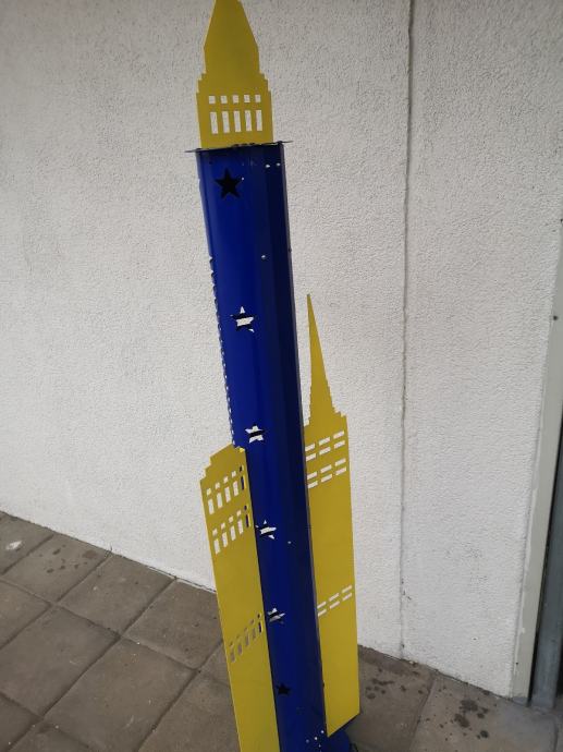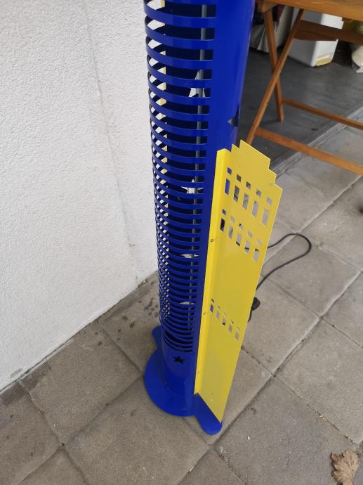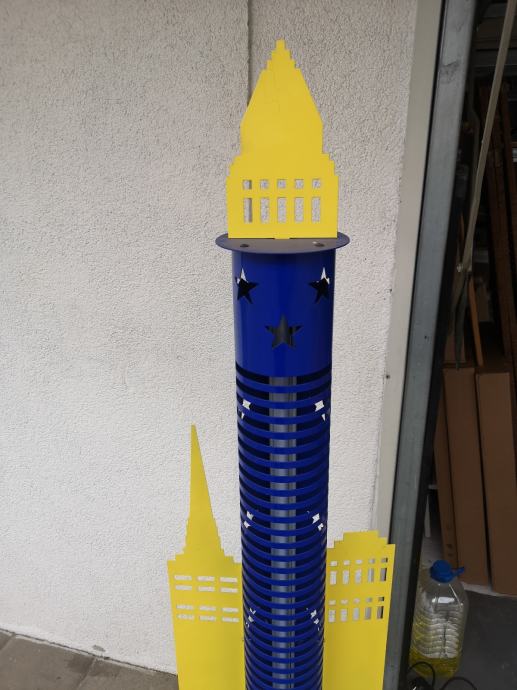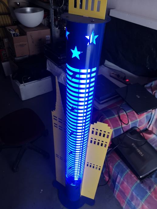 Metalni stalak za CD, neonska lampa. Ambijetalno svjetlo, nožni prekidač. Vizura grada. Visina 157 x š 36 x d (postolje) 25 cm.