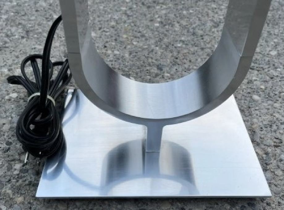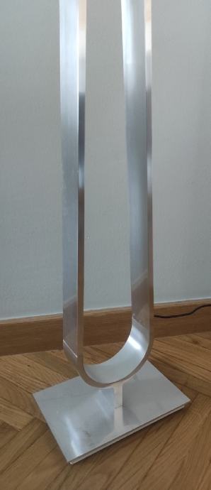 Ikea Klabb podna svjetiljka/lampa, dimenzije 150 cm visine, 15 cm širine, 23 cm dužine, pomična kugla za pojačavanje razline svjetla, LED žarulja, kromirani metal, bijela čvrsta tkanina za ambijentalno raspršenje svjetla. Dugi kabel crne boje, uputstva za upotrebu.