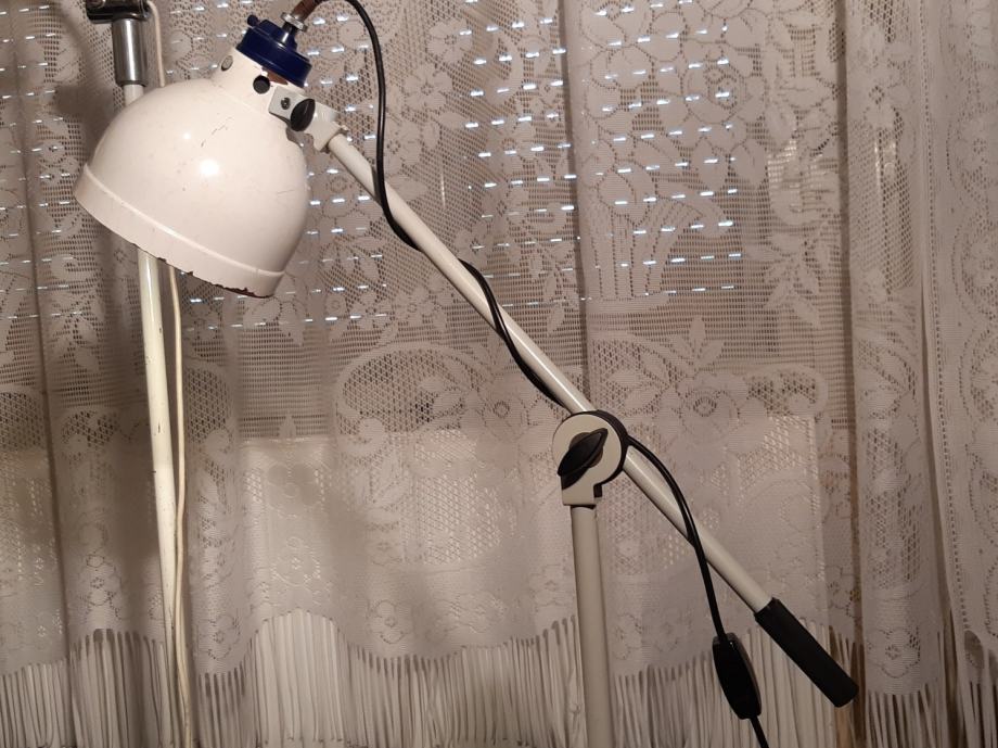 Vintage podna lampa, industrijski stil. Stalak i lampa su bijele boje.