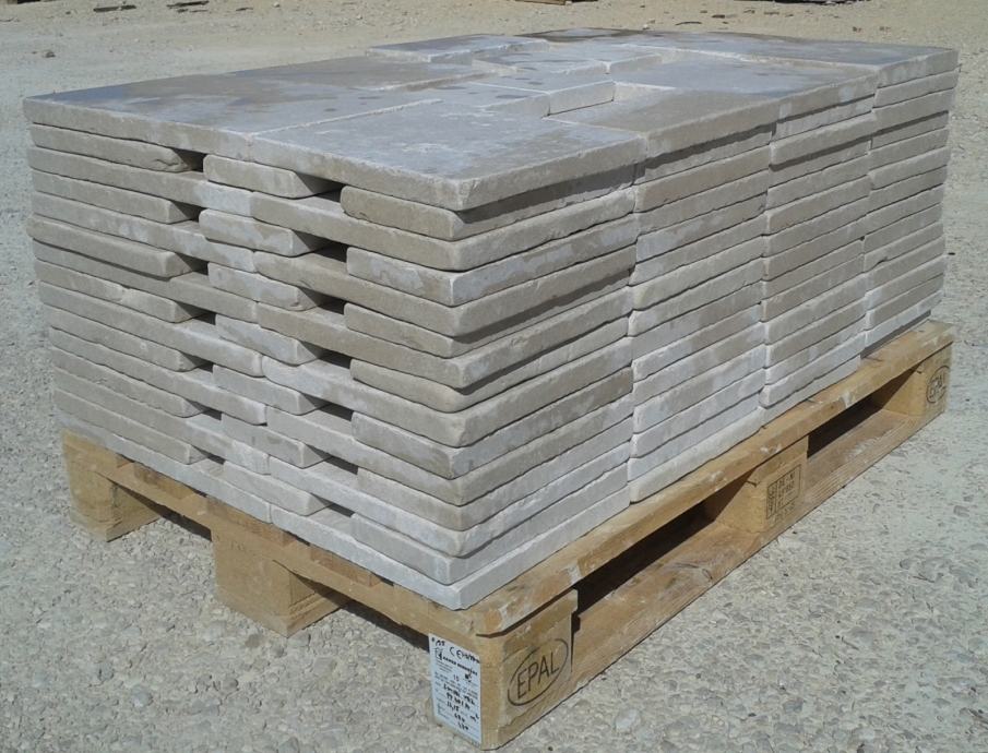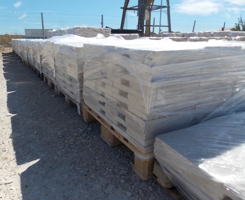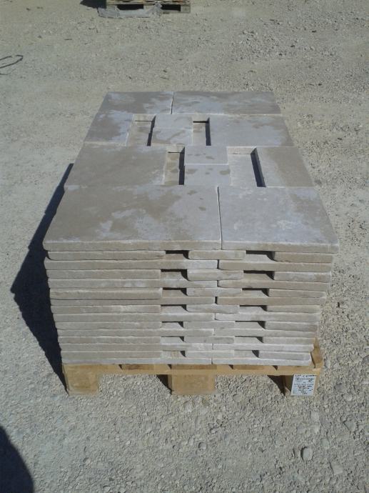 15x15, 30x15, 30x30 i 45x30 cm. Debljina kamena je 3 cm. Jedan red na euro paleti pokriva 0,81 m2. Na paleti se nalazi 15 redova što iznosi ukupno 12,15 m2.