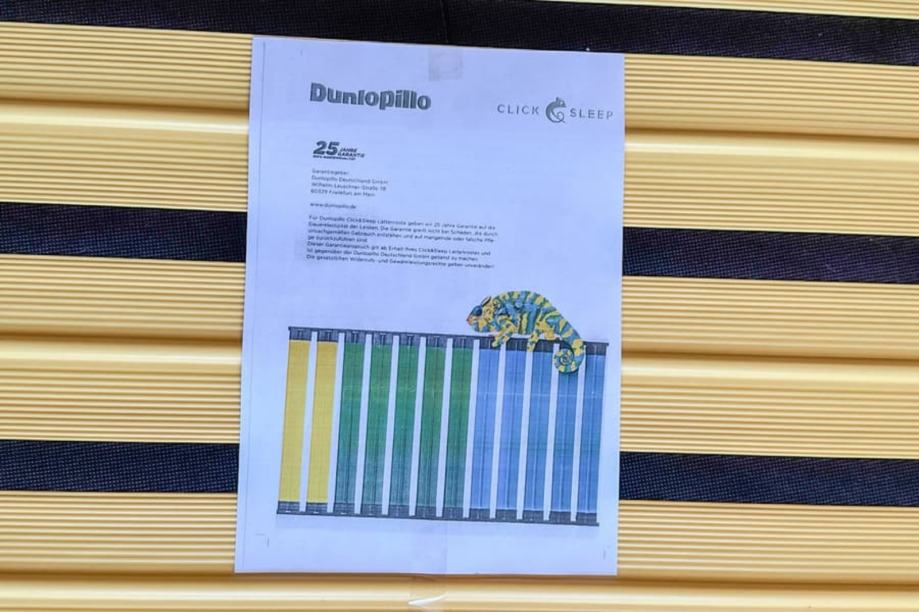 Podnica Dunlopillo Click&Sleep X1 koristi inovativan sustav letvica od fiberglasa i plastike koji omogućuje prilagodbu vašeg osjećaja ležaja [1.1, 1.4]. Različite boje letvica označavaju različite razine tvrdoće ili čvrstoće: