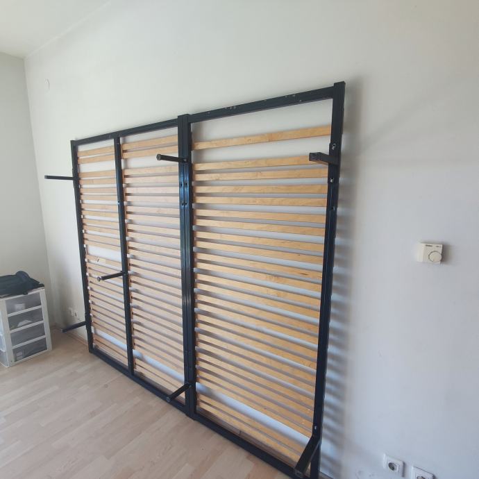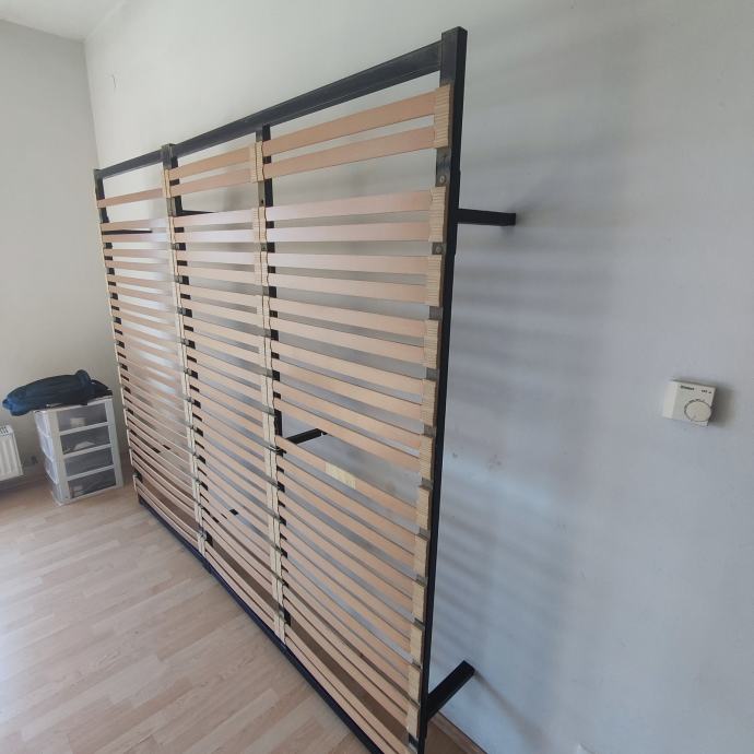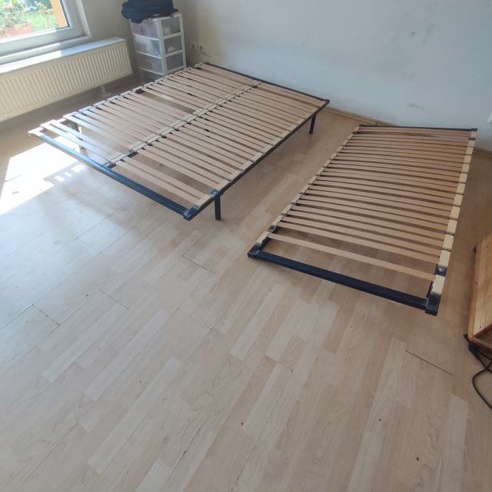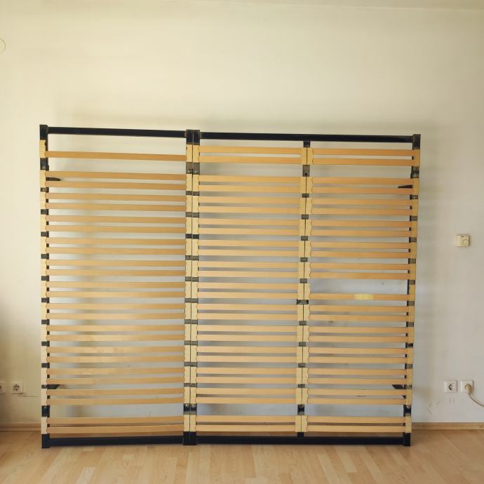 Prodajem samostojeću podnicu 230x195 cm. Sastoji se od dvije podnice povezane u jednu (140x195 i 90x195). Podnice se mogu koristiti i svaka zasebno ali je u tom slučaju potrebno dokupiti ili napraviti još dvije nogice. Imam samo 6 nogica jer su podnice korištene spojene. Kao što je vidljivo na slikama dvije letvice fale. Letvice se mogu premještati jednostavnim vađenjem i umetanjem u za to predviđene utore.
