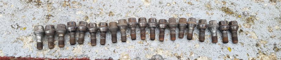 Prodajem 20 šarafa za felge. Bili su na BMW e36 iz 1996. godine i u vrlo dobrom su stanju, navoji bez oštećenja, svi ispravni i svi odlično drže. Glava 17 mm, dok je dužina cijelog šarafa 5 cm. Prodaje se isključivo svih 20 komada u kompletu, dakle ne prodajem po komadu.
