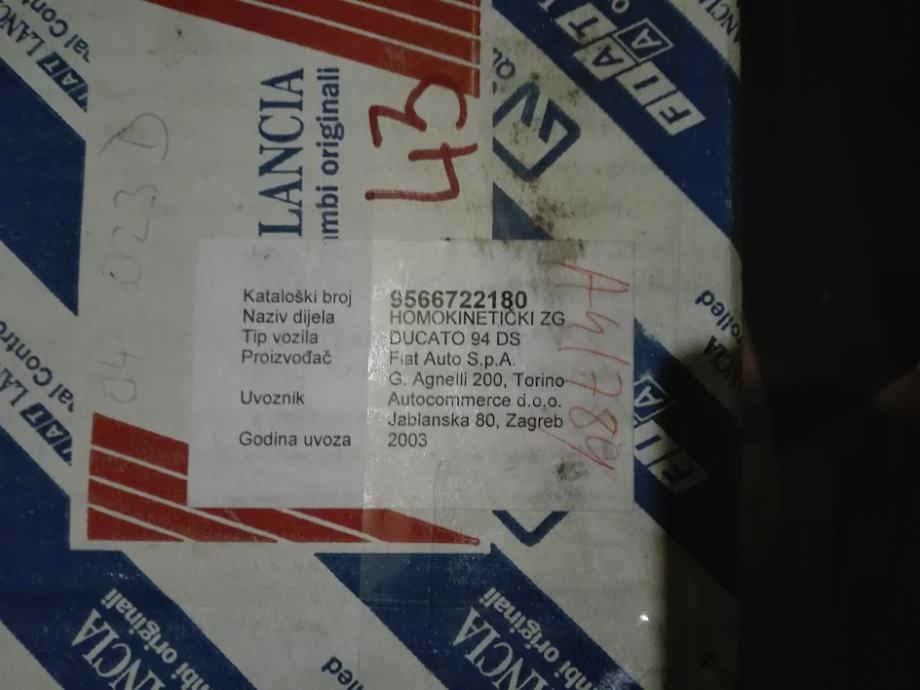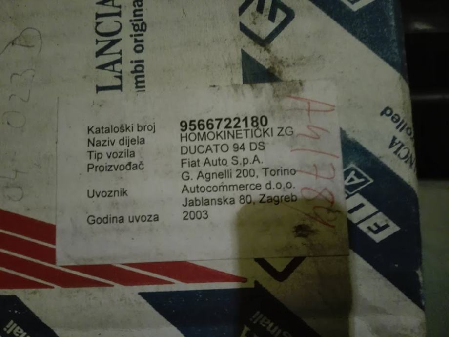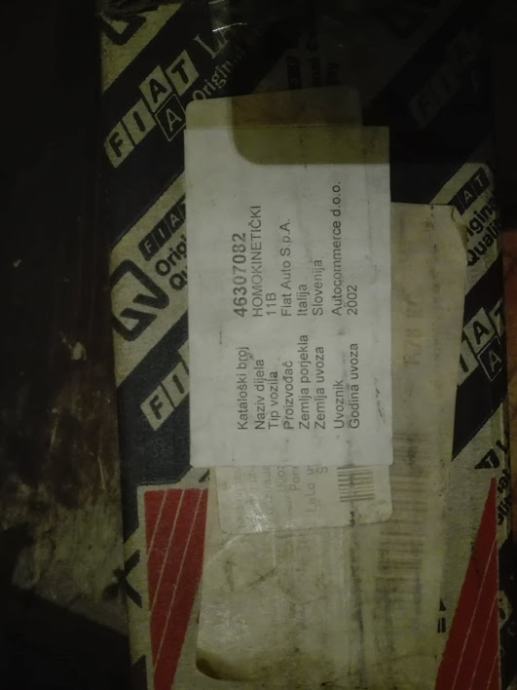 HOMOKINETIČKI ZGLOBOVI ZA FIAT PUNTO, BRAVA, BRAVO, CROMA, UNO, MAREA, LANCIA DELTA, DEDRA, DUCATO,CITROEN YUMPER, PEUGEOT BOXER i DRUGA VOZILA. KATALOŠKI BROJEVI: 7688157, 46307094, 46307082, 7656786, 9566722180, 95646292. NOVI ORGINALNI FIAT DIJELOVI ZA PRVU UGRADNJU. CIJENA PO KOMADU 100 KN, A ZA TERETNA VOZILA 200 KN.