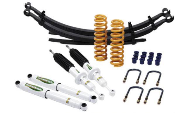 Lift kit se sastoji od: 4 nova povišena amortizera, novih lisnatih opruga, spiralnih opruga, te svih vijaka i gumica potrebnih za montažu na vozilo.