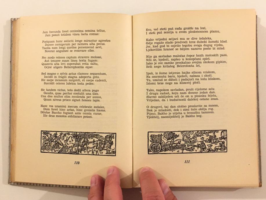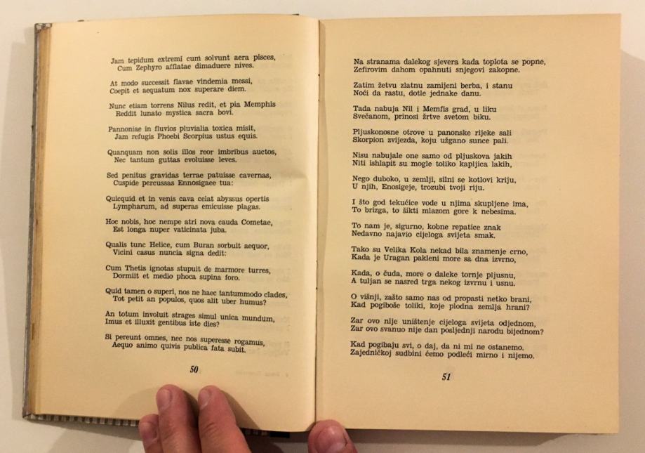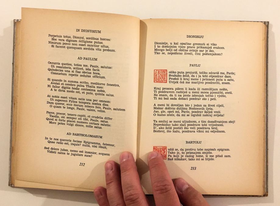Knjiga pjesama poznatog hrvatskog pjesnika petnaestog stoljeća u dvojezičnom (latinskom i hrvatskom) izdanju iz 1951. godine.