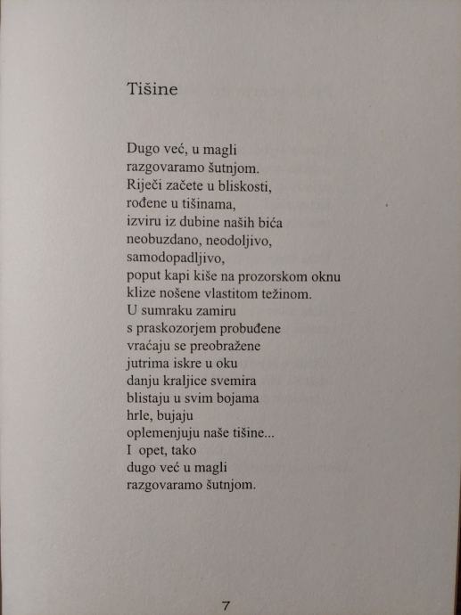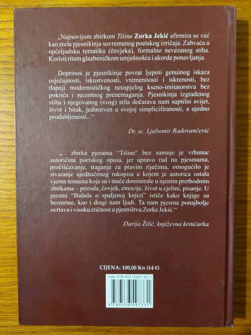 ... zbirka pjesama “Tišine” bez sumnje je vrhunac autoričina poetskog opusa, jer upravo rad na pjesmama, pročišćavanje, traganje za pravim riječima, omogućilo je stvaranje ujednačenog rukopisa u kojem je autorica ostala vjerna temama koje su i inače dominirale u njenim prethodnim zbirkama – priroda, čovjek, emocije, život u cjelini, pisanje. U pjesmi “Balada o spaljenoj knjizi” ističe kako knjige su besmrtne, kao i dragi nam ljudi. Ta nam pjesma ponajbolje ocrtava i visoku etičnost u pjesništvu Zorke Jekić.