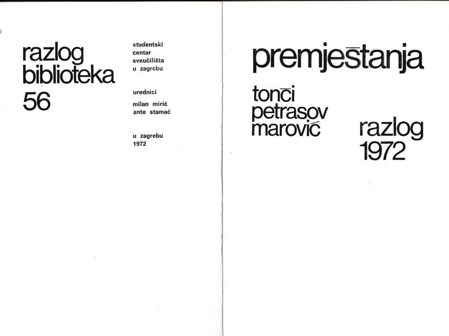Tonči Petrasov Marović: Premještanja, Studentski centar Sveučilišta u Zagrebu, Zagreb 1972.