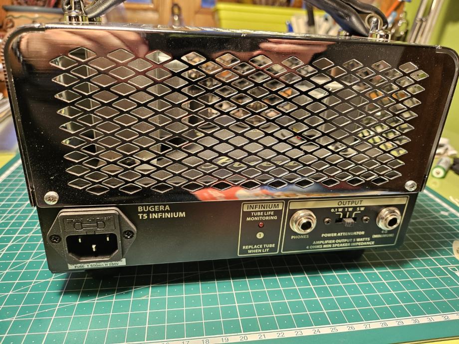 Prodajem Bugera T5 INFINIUM gitarsko pojačalo sa 5W A-klase i sa omiljenim značajkama revolucionarne INFINIUM Tube Life Multiplier tehnologije. Ugrađeni 2-smjerni prigušivač snage omogućava dobivanje ultimativnog zvuka pri bilo kojoj glasnoći, čak od 0,1W. Topli zvuk, reverb efekt visoke rezolucije i booster. Vrhunsko lampaško pojačalo s vintage izgledom i bogatim tonom. 1x12AX7 i 1xEL34 lampe.