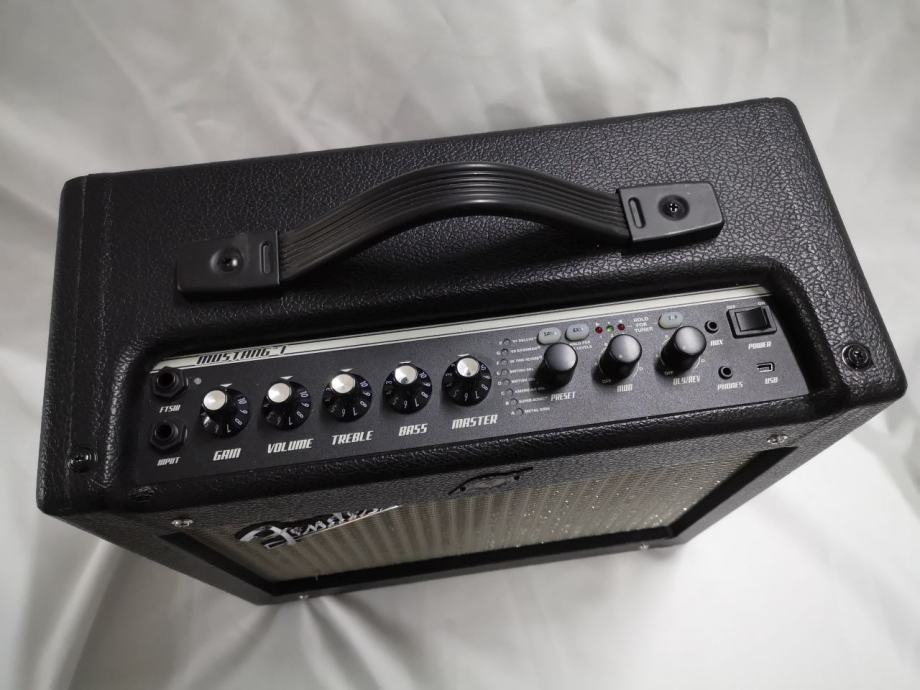 gitarsko pojačalo, snage 20 watt. zvučnik 1x 8" Special Fender Design 8 Ohms, 24 preseta, kontrole: gain, volume, treble, bass, master, preset select, modulation speed, delay/reverb select, save button, exit Button, tap tempo button. Ugrađeno 12 digitalnih efekata (chorus, flanger, tremolo, vibratone, octaver, phaser, step filter, new effects including big fuzz, green screamer and intelligent pitch shifting); 12 delay/reverb effects (including tape delay, stereo/mono delay, room/plate/hall reverb); aux input, headphone output (mini-jack, doubles as speaker emulated line out), speaker emulated USB out, težina samo 7.7kg. Izvrsno očuvano, doslovno kao novo, s pismenom garancijom do 14.08.2021. godine.