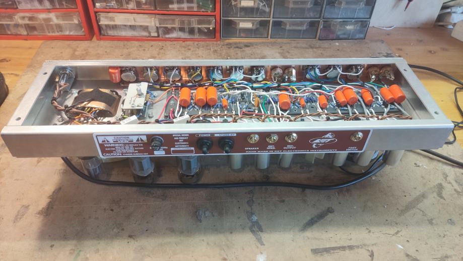 Unutrašnjost pojačala je rađena point to point tehnikom.