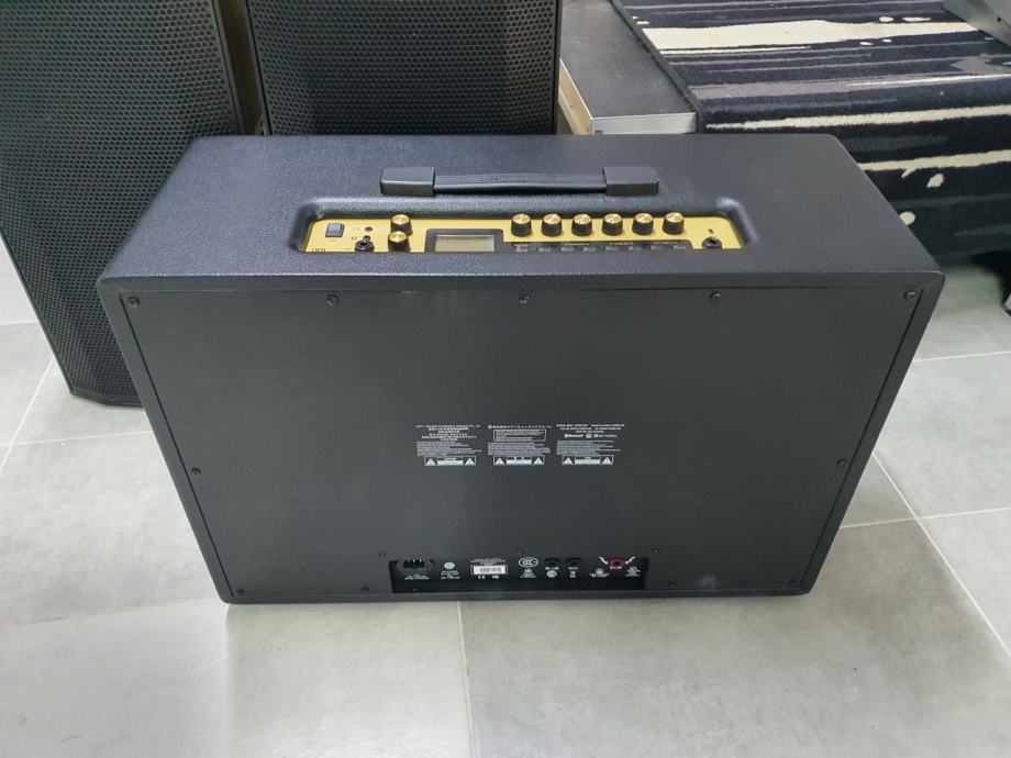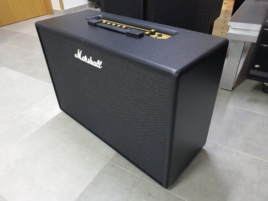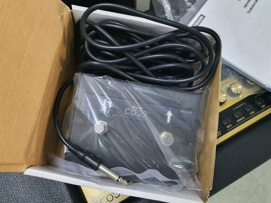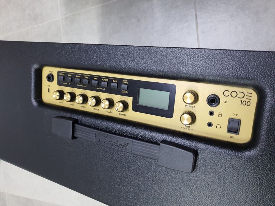 gitarsko pojačalo snage 100W; staro tek dva mjeseca, s pismenom garancijom od 2 godine; odabir između 100 presetova, potpuno je podesivo tako da možete svirati bilo gdje, bilo kada, uz mogućnost spajanja na Vaš pametni telefon ili računalo. Pomoću Bluetooth konekcije, kontrolirajte CODE i streamajte glazbu sa Vašeg iOS ili Android uređaja koristeći Gateway aplikaciju. Skinite sa ili uploadajte na globalnu zbirku korisničkih presetova na MyMarshall. CODE ima brojne značajke, te postoje video zapisi koji će Vam pomoći kako koristiti CODE da dobijete zvuk koji želite. Pojačalo je doslovno kao novo, a uz njega dolazi i originalni PEDL-91010 footswitch.