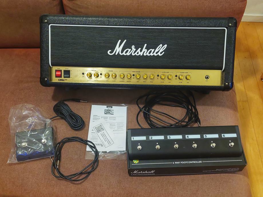 Prodajem Marshall DSL 100 tube head kupljeno preko thomanna pred cca godinu i pol dana. Pojačalo je izrazito malo korišteno, što se može i vidjeti da gotovo i nema tragova korištenja a razlog prodaje je što ne sviram puno i stoji mi već neko vrijeme. Pojačalo ima 4 kanala te dva master volumea (odlično za volume boost na lead dionicama) koji se mogu izmjenjivati preko dodatnog Marshallovog footswitcha PEDL-91016 kojeg sam također uzeo novog preko thomanna, te ga dajem uz pojačalo. Također uz pojačalo ide i originalni mali footswitch te originalni speaker kabel.